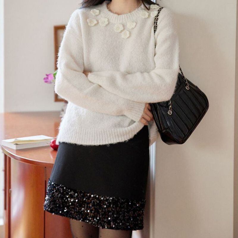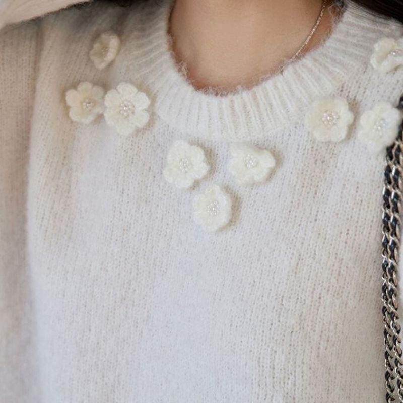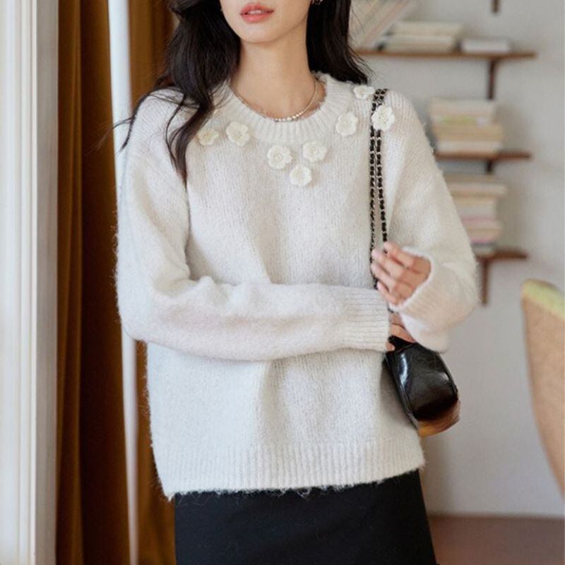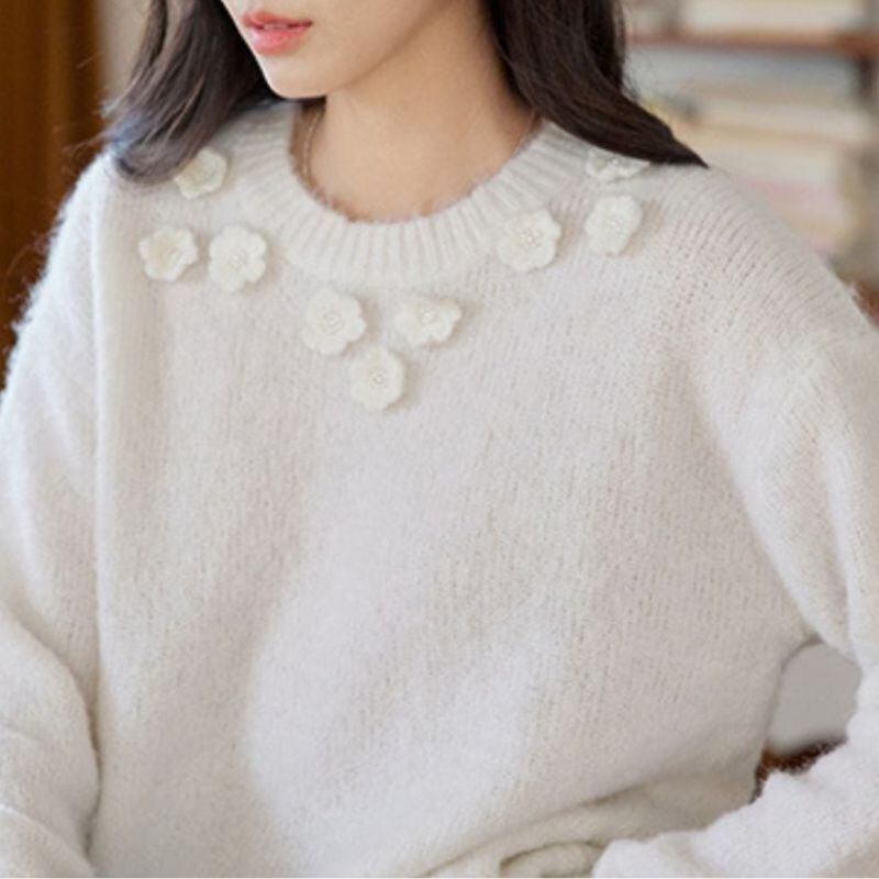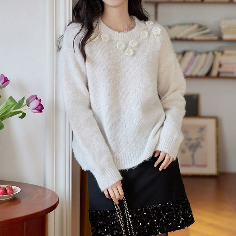クルーネックの長袖ニットは、どんなスタイルにも合わせやすい万能アイテムです。胸元に施されたフラワーモチーフが、さりげないアクセントとなり、着るだけで女性らしさを演出します。カジュアルなパンツスタイルから、スカートを合わせたフェミニンなスタイルまで、幅広いコーディネートを楽しめます。一枚持っていると便利な、着回し力の高いアイテムです。
