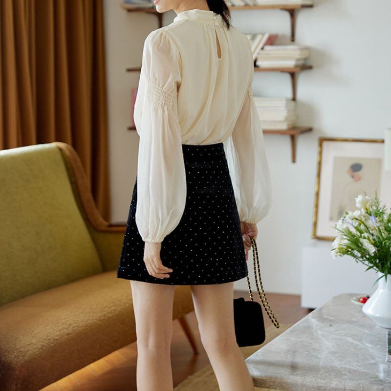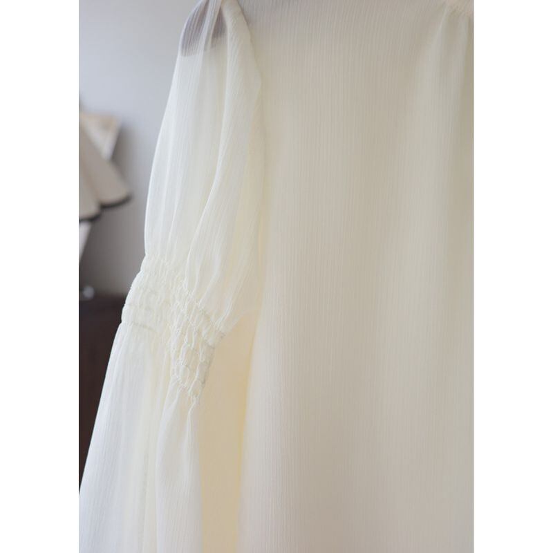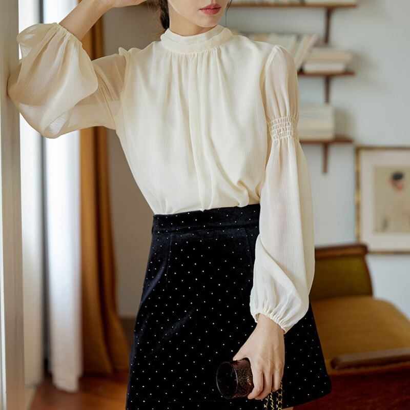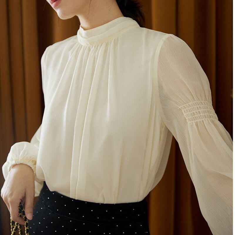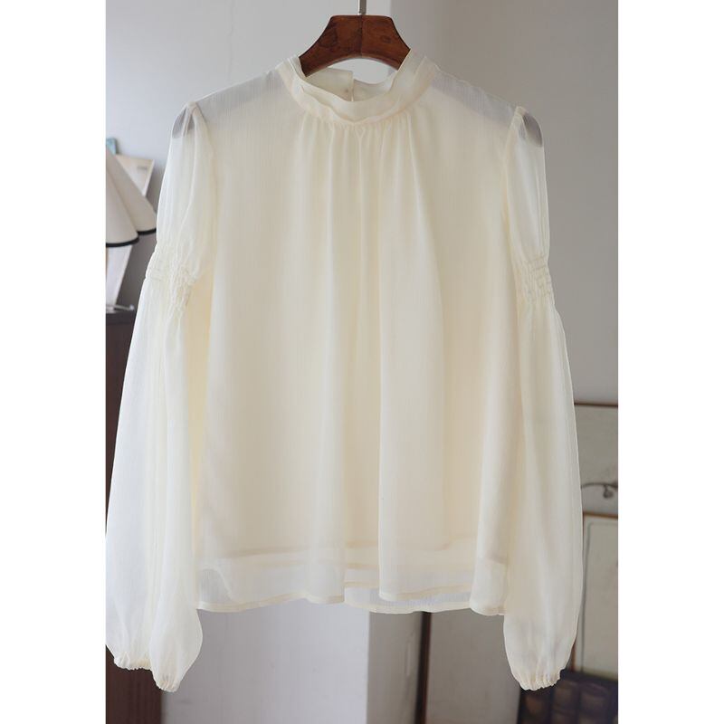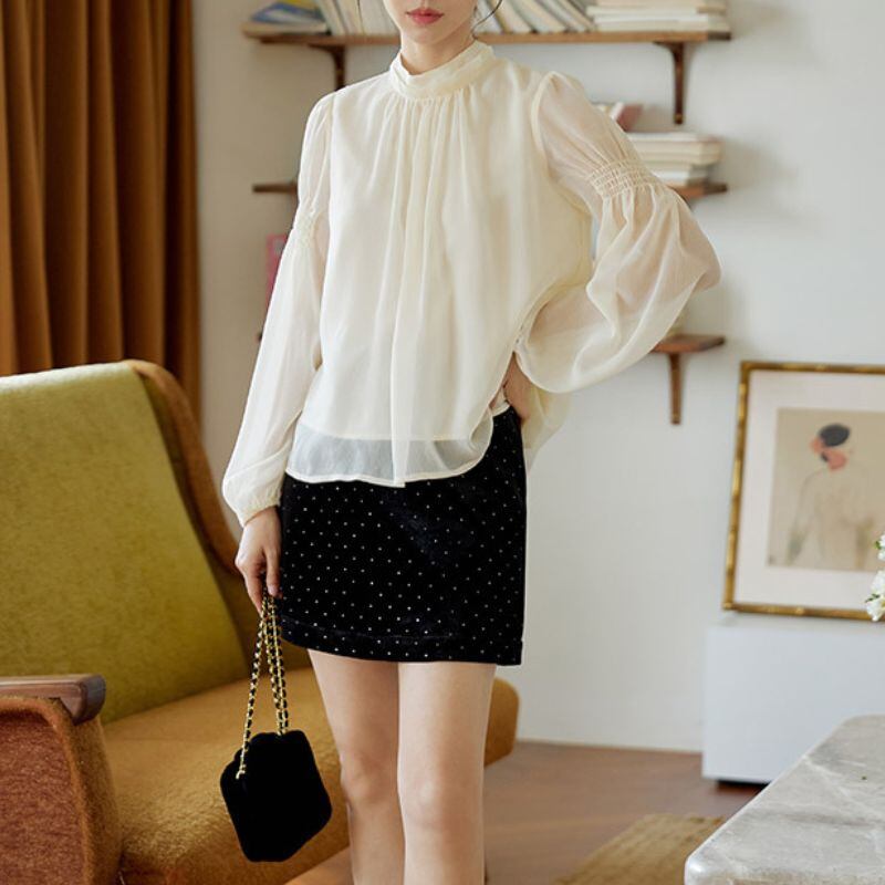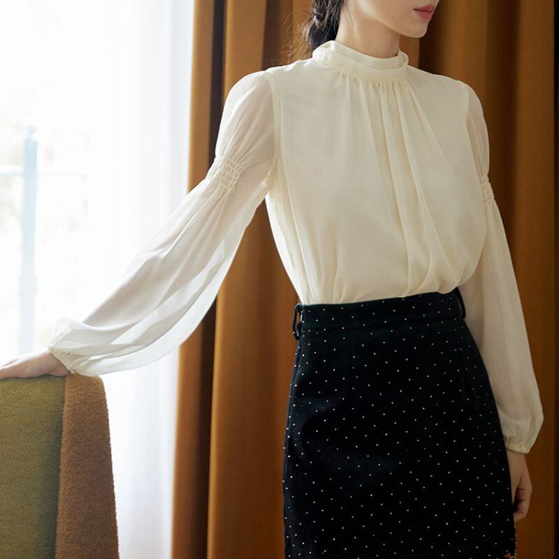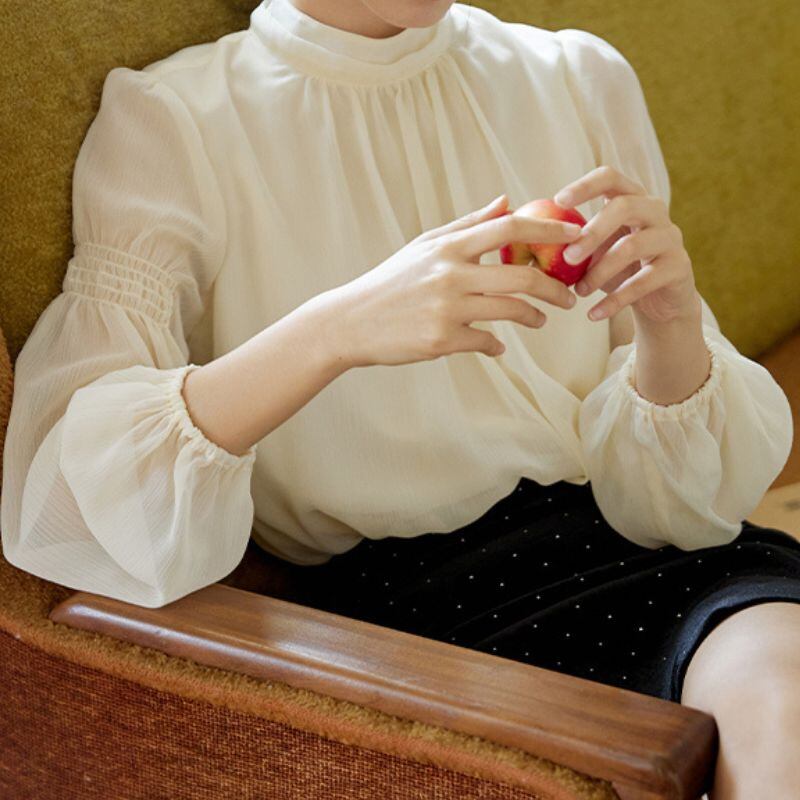 透け感のあるスリーブとハイネックのギャザーデザインが上品なブラウス。軽やかな雰囲気と女性らしいシルエットで、きれいめからフェミニンまで幅広く着こなせます。