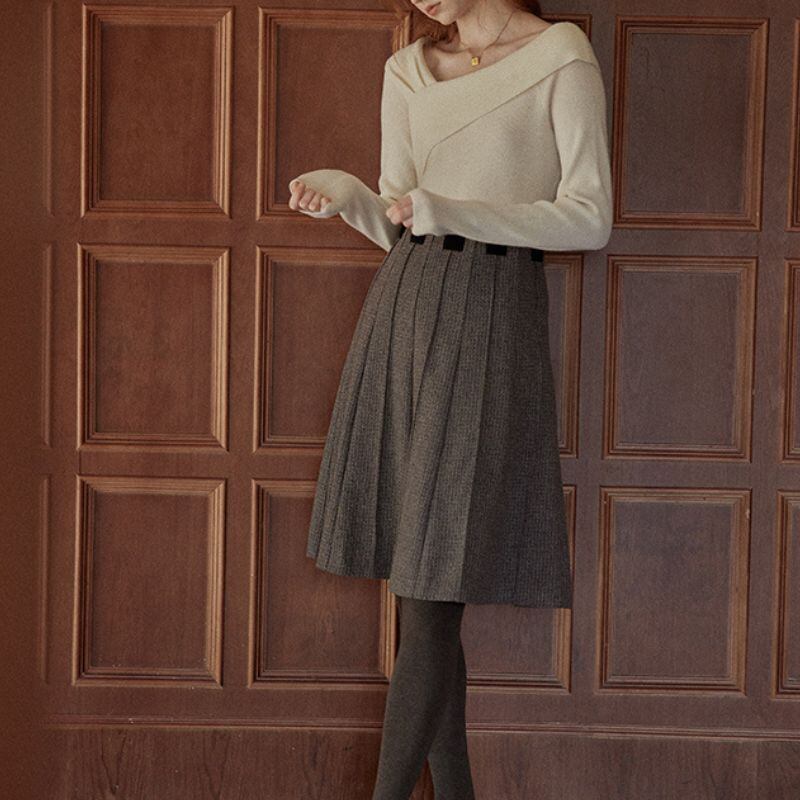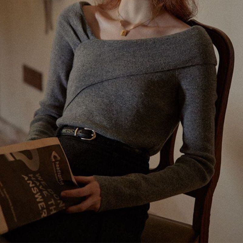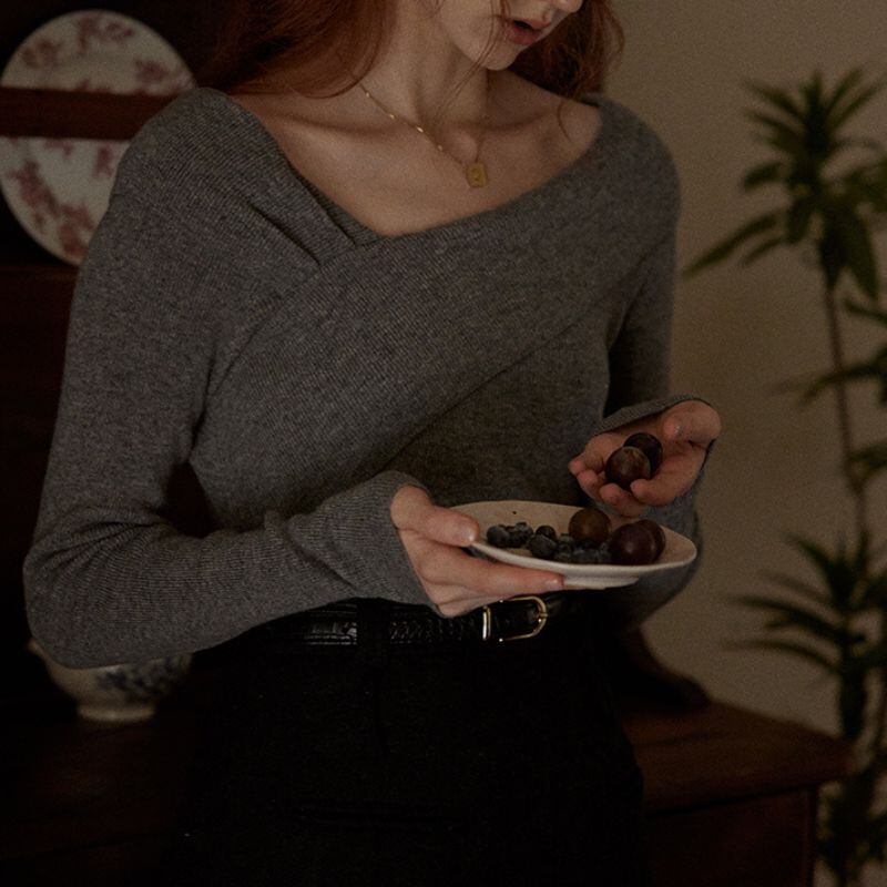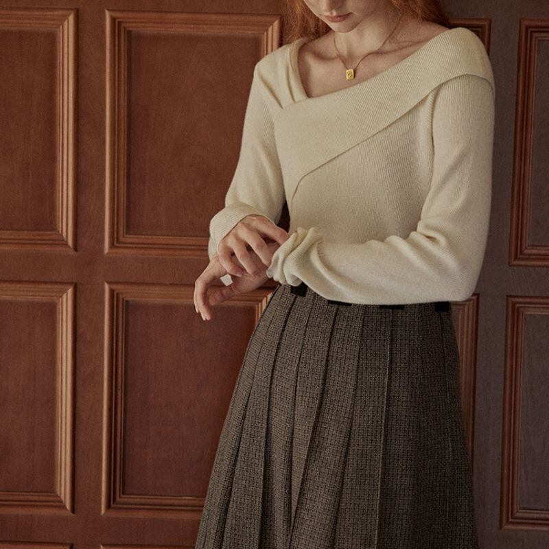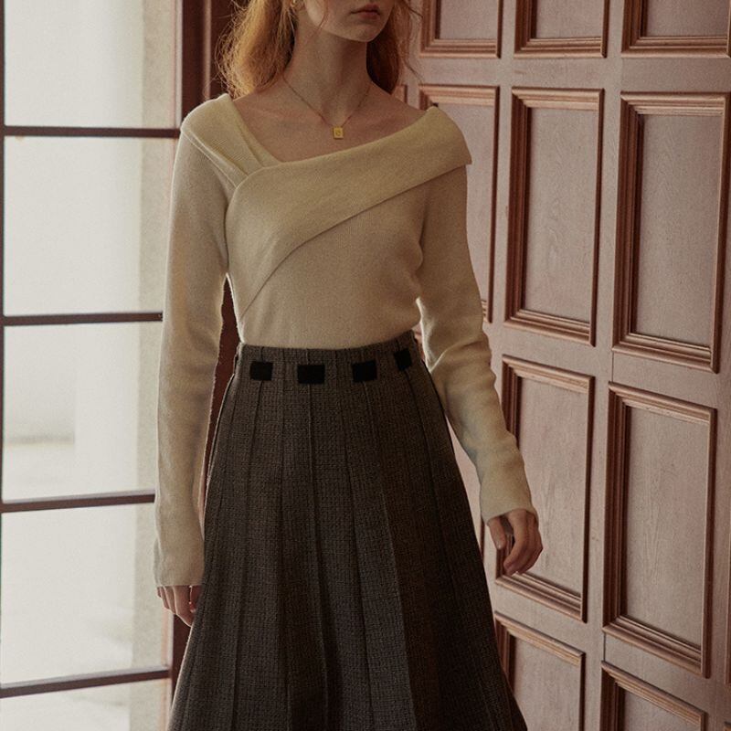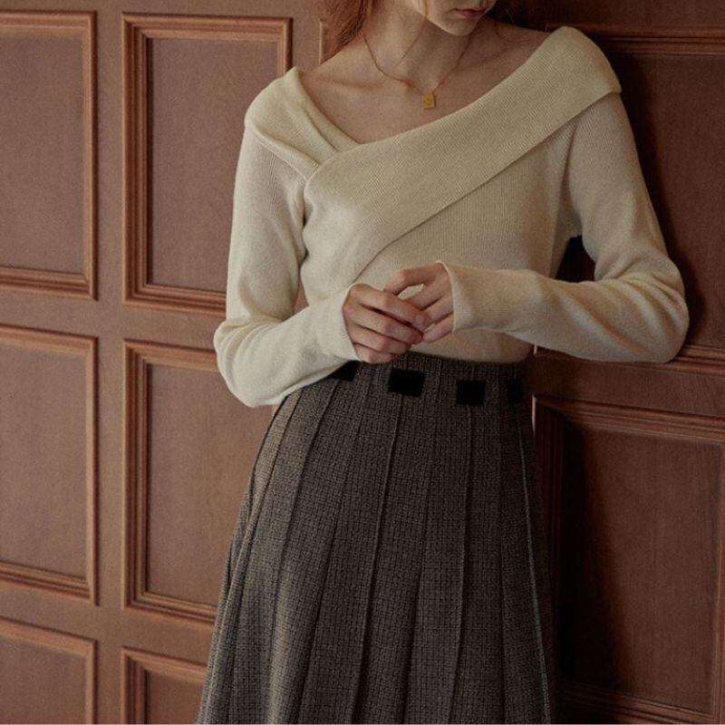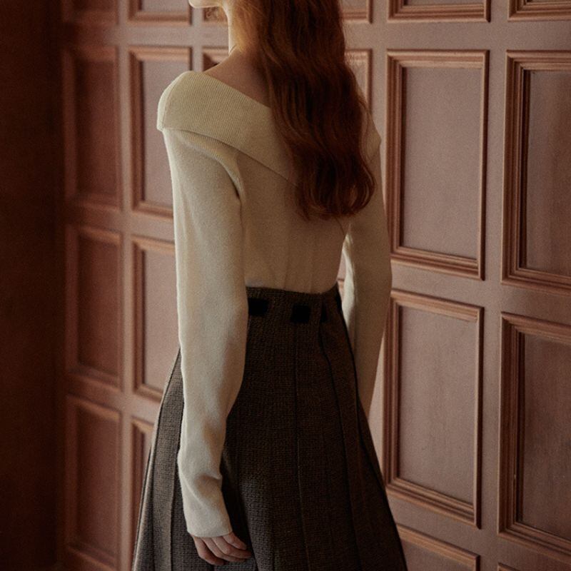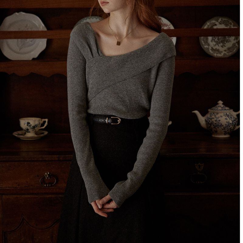 クロスデザインが洗練された印象を与える長袖ニット。オフショルダーデザインが、さりげなく肌見せし、女性らしさを演出します。シンプルなデザインなので、様々なボトムスと合わせやすく、デイリーユースからオフィススタイルまで幅広いシーンで活躍します。一枚で着映えする、着回し力の高いアイテムです。