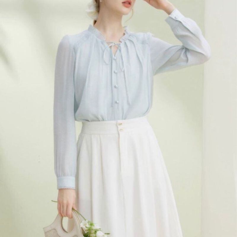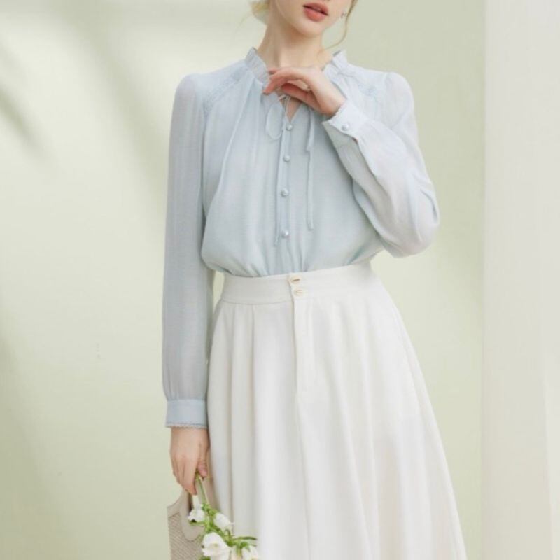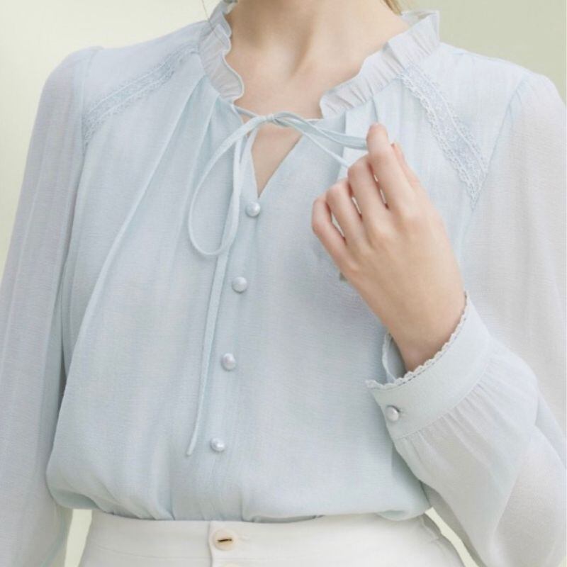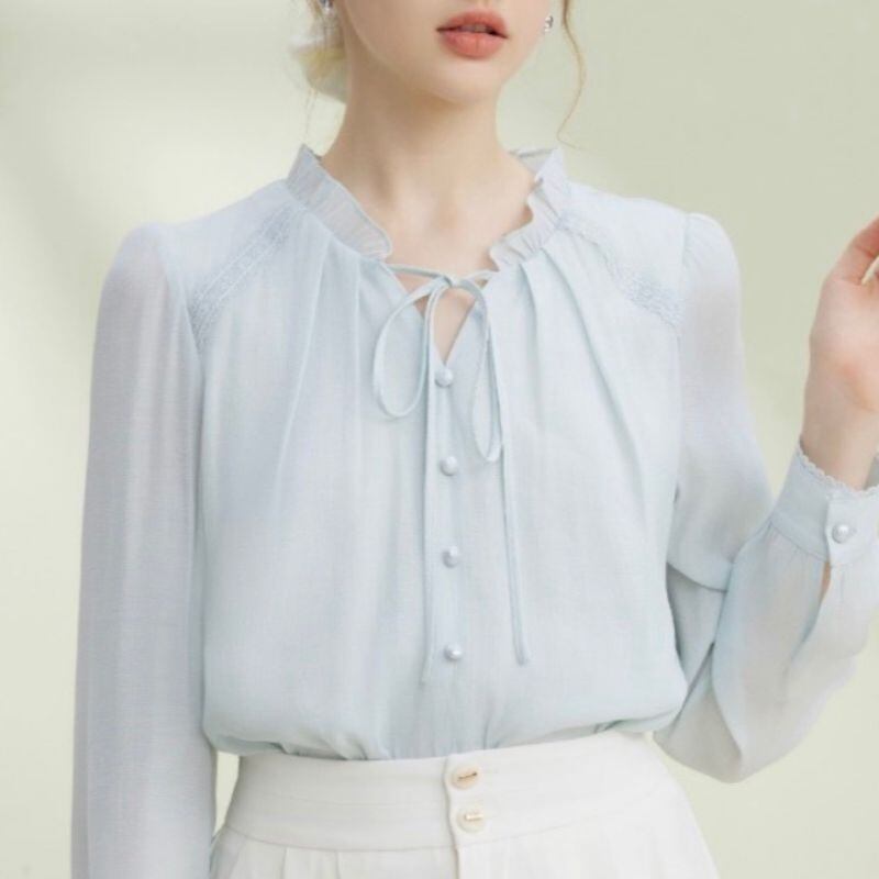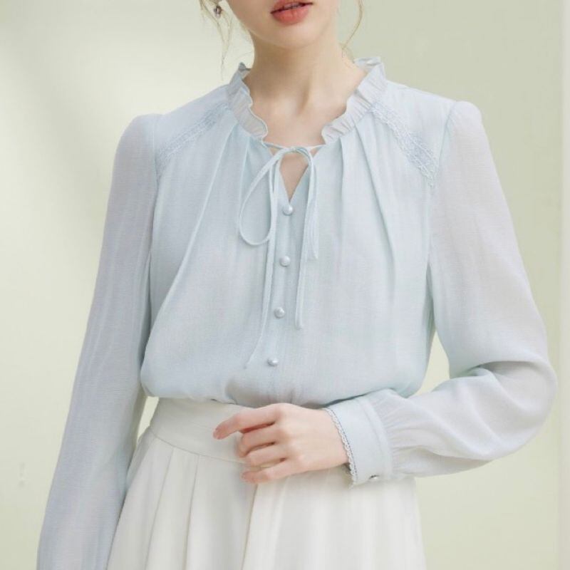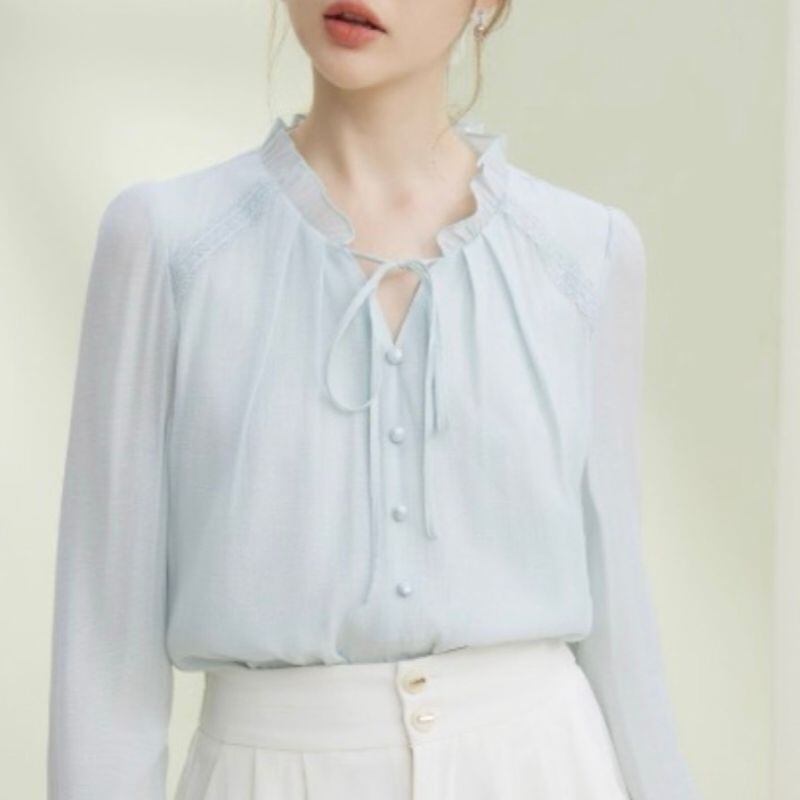 繊細なフリルネックとリボンタイが可憐な印象を与えるブラウス。くるみボタンの縦ラインがさりげない華やかさを添え、女性らしいスタイルを引き立てます。
