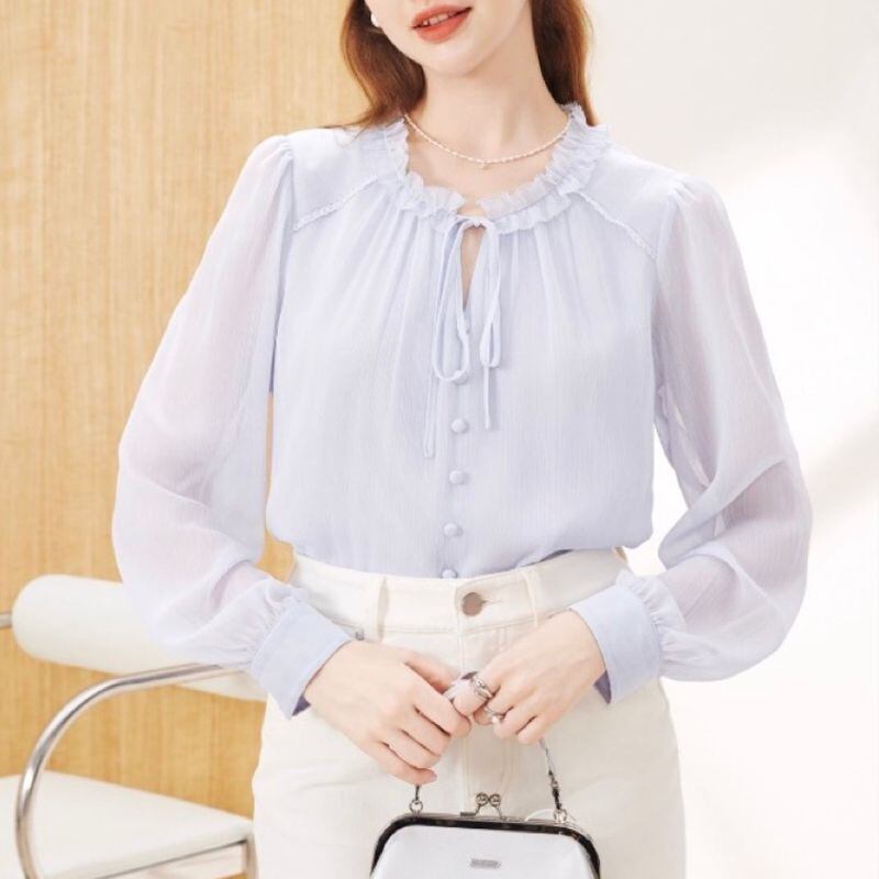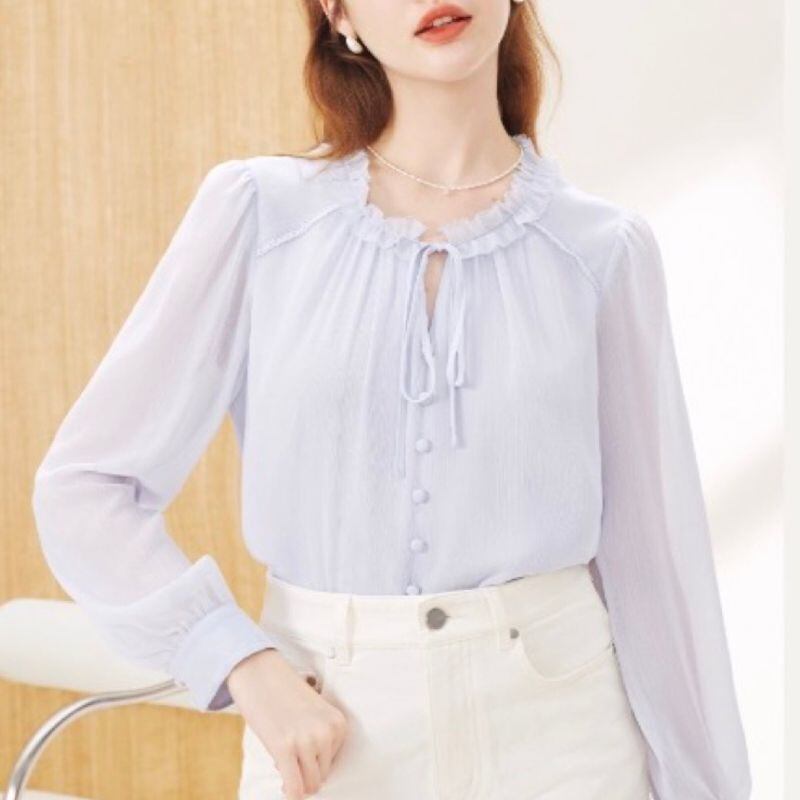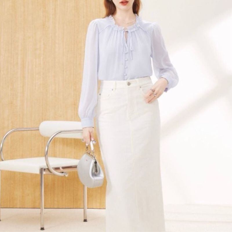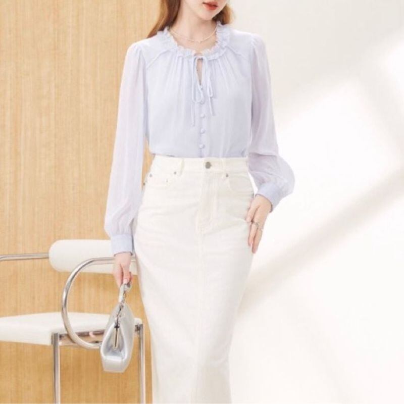 ほんのり透け感のあるパープルが、優しげなムードを演出するブラウス。首元のフリルとリボンタイ、並んだくるみボタンがフェミニンなアクセントに。白のスカートと合わせれば、春らしい爽やかな装いに。