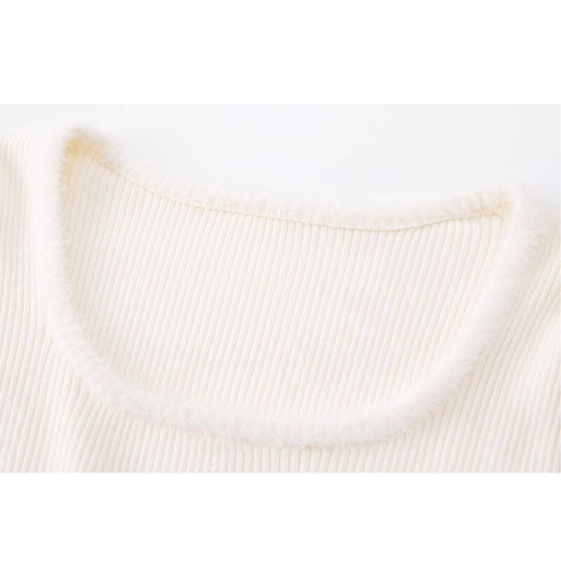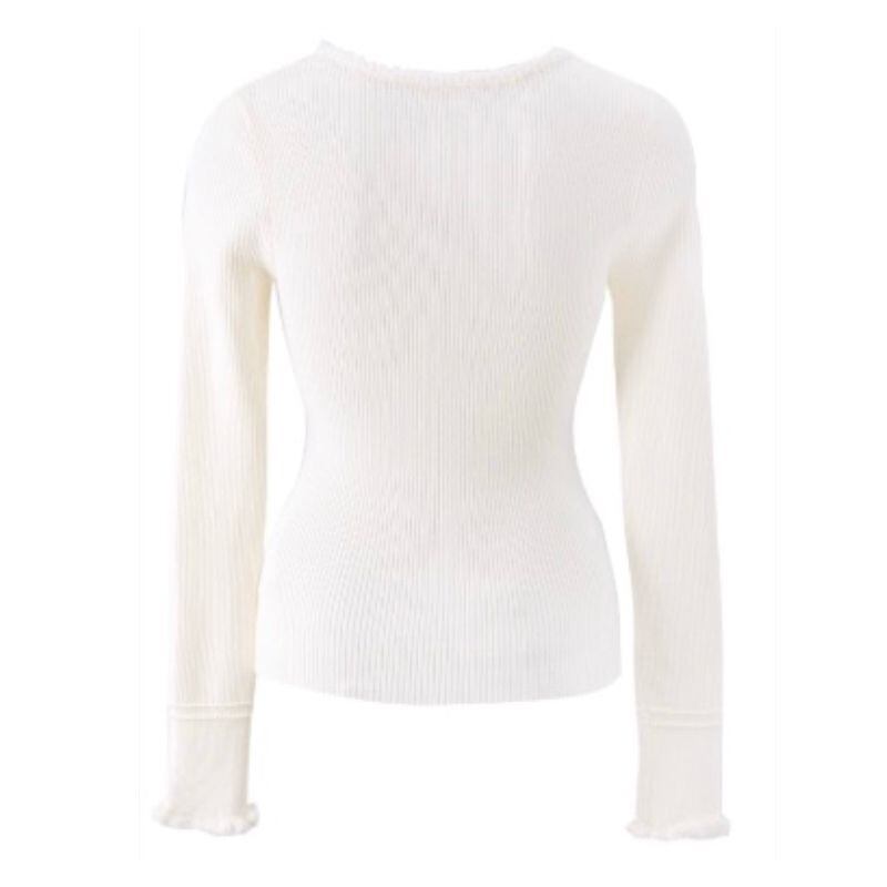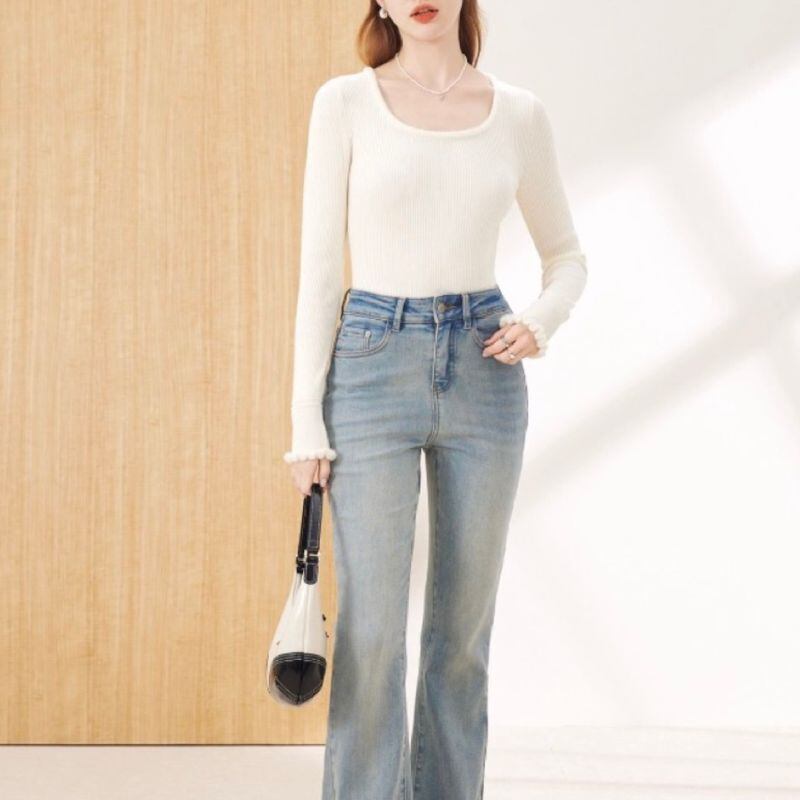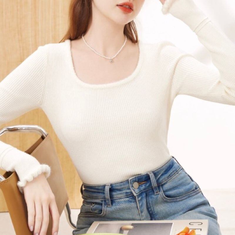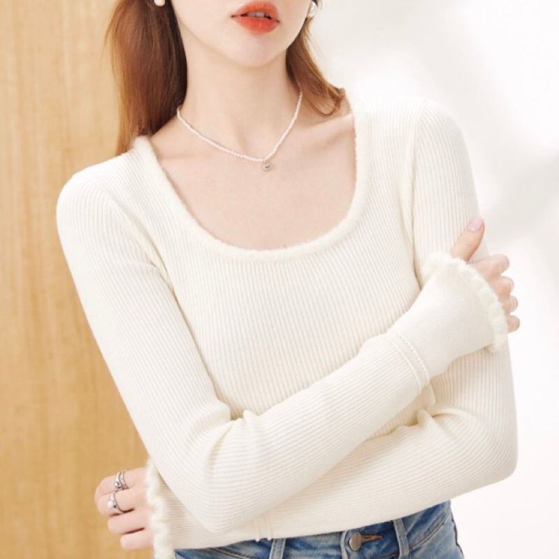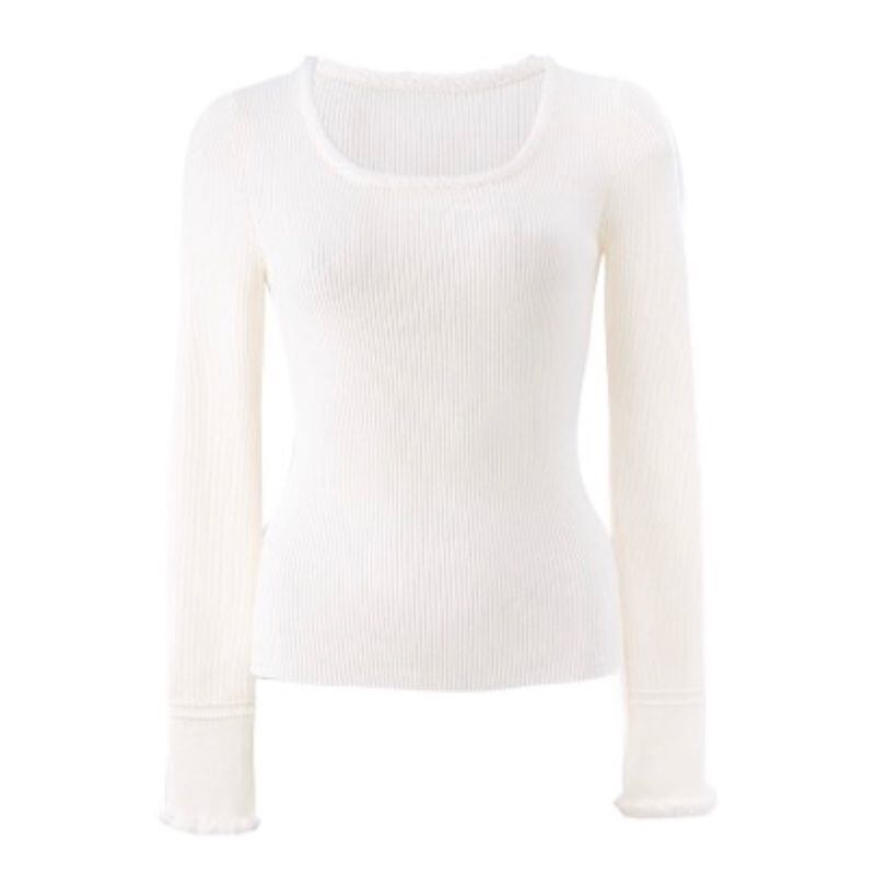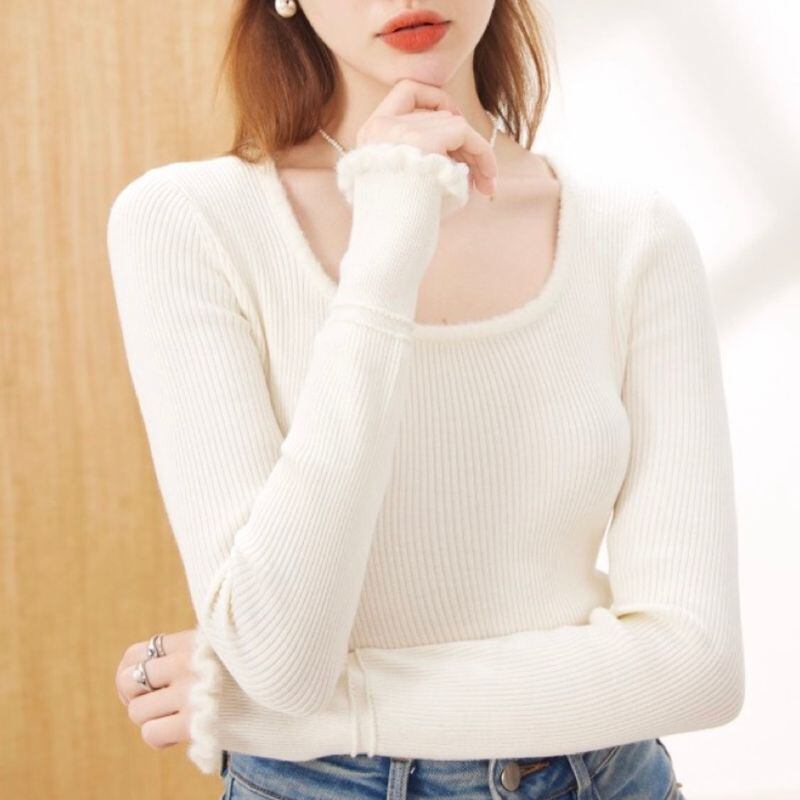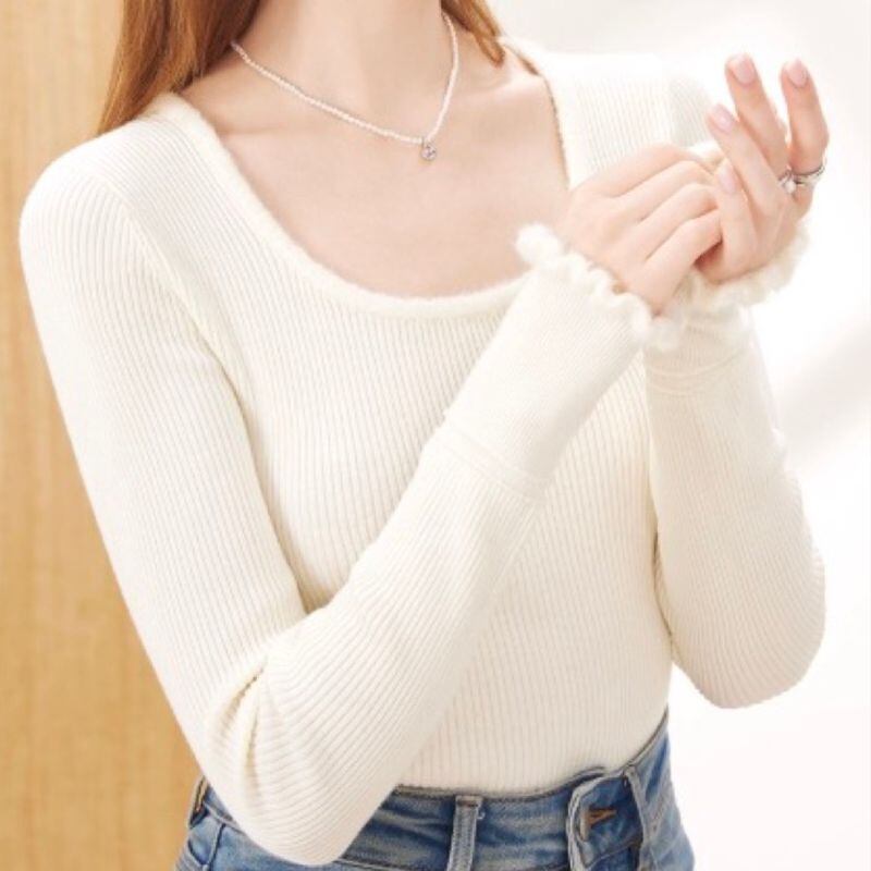 スクエアネックと袖口のフリルが、シンプルながらも女性らしい魅力を引き立てるプルオーバー。リブニットの程よいフィット感が、体のラインを美しく演出します。カジュアルなパンツスタイルから、スカートを合わせたフェミニンな装いまで、幅広いコーディネートに活躍します。一枚で着映えする、着回し力の高いアイテムです。