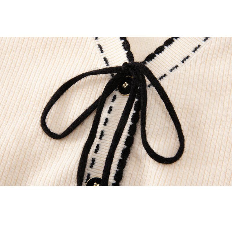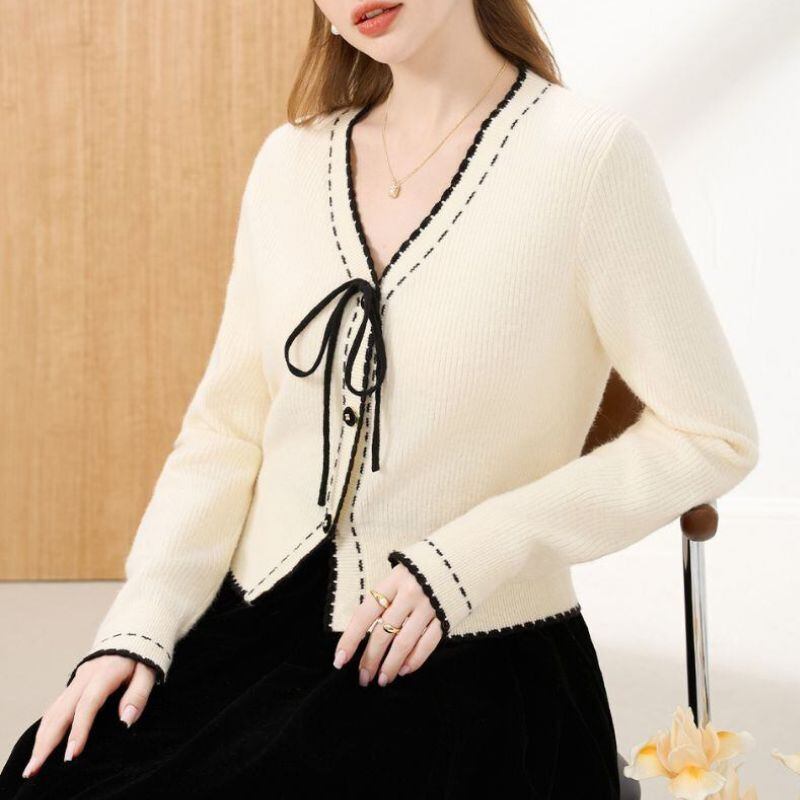 Vネックに沿ってあしらった配色ステッチと、フロントのリボンタイがポイントのカーディガン。上品さと可愛らしさを兼ね備え、ワンピースにもパンツスタイルにも合わせやすい一枚です。