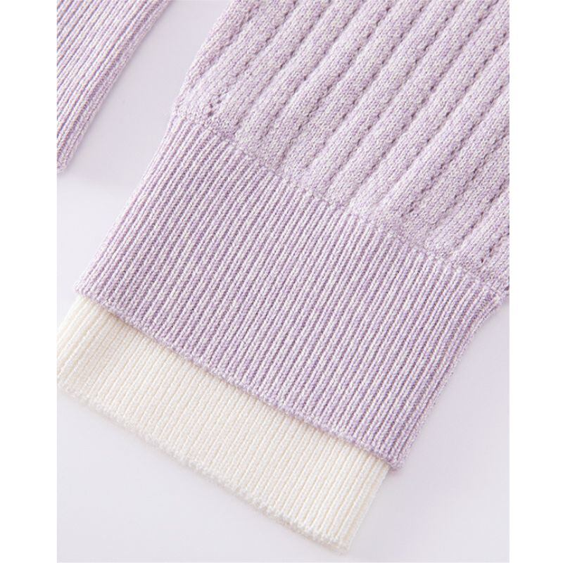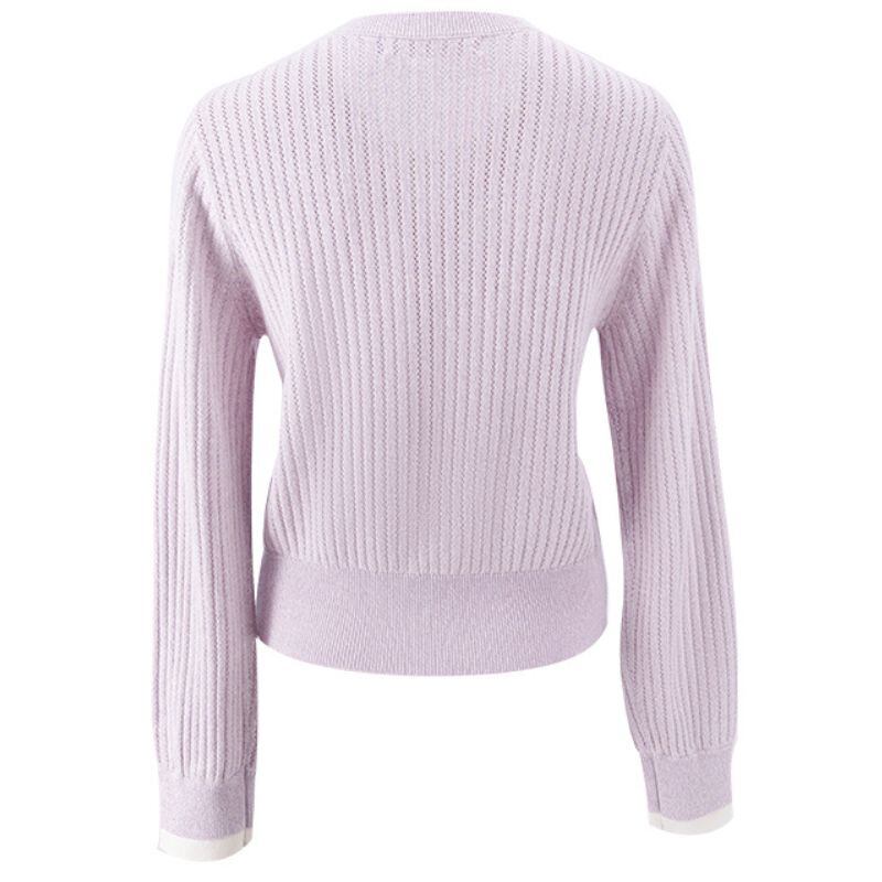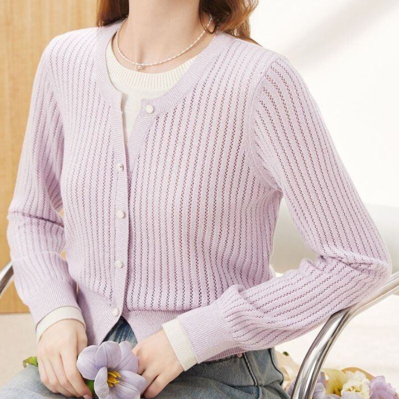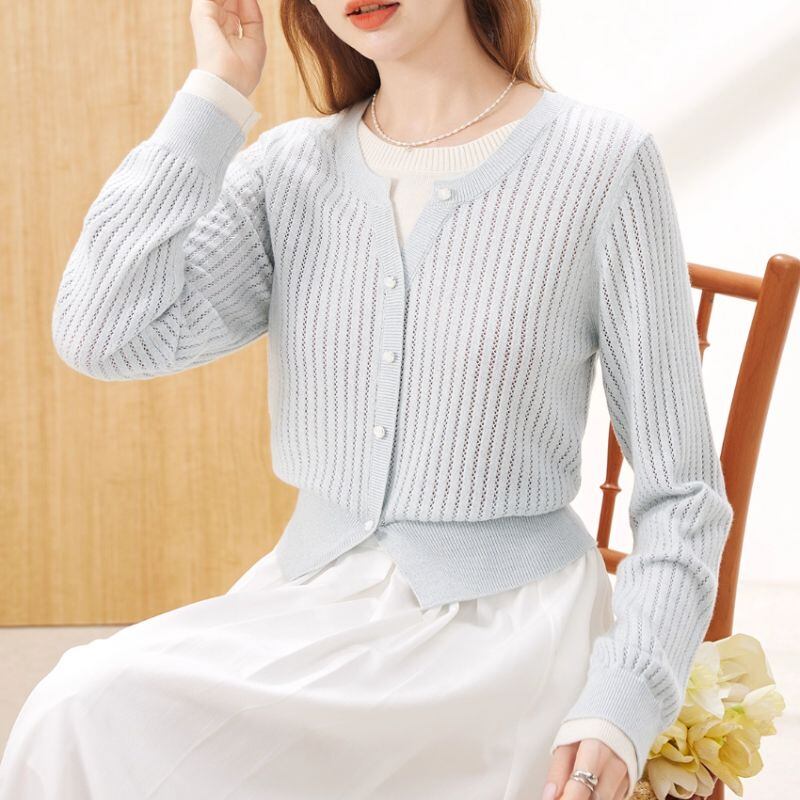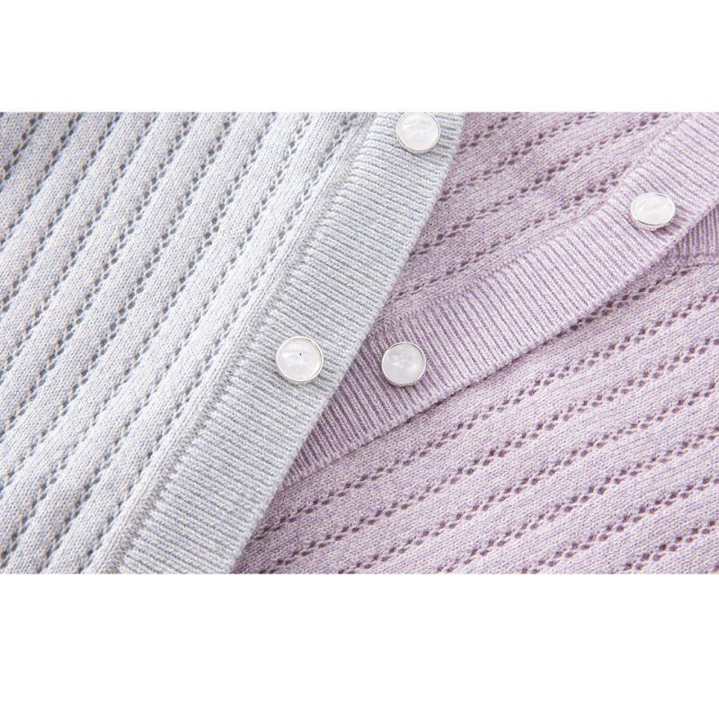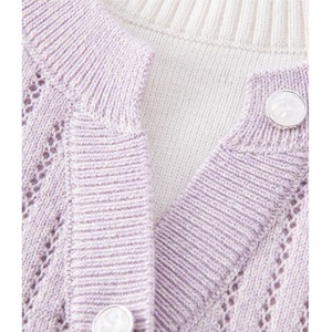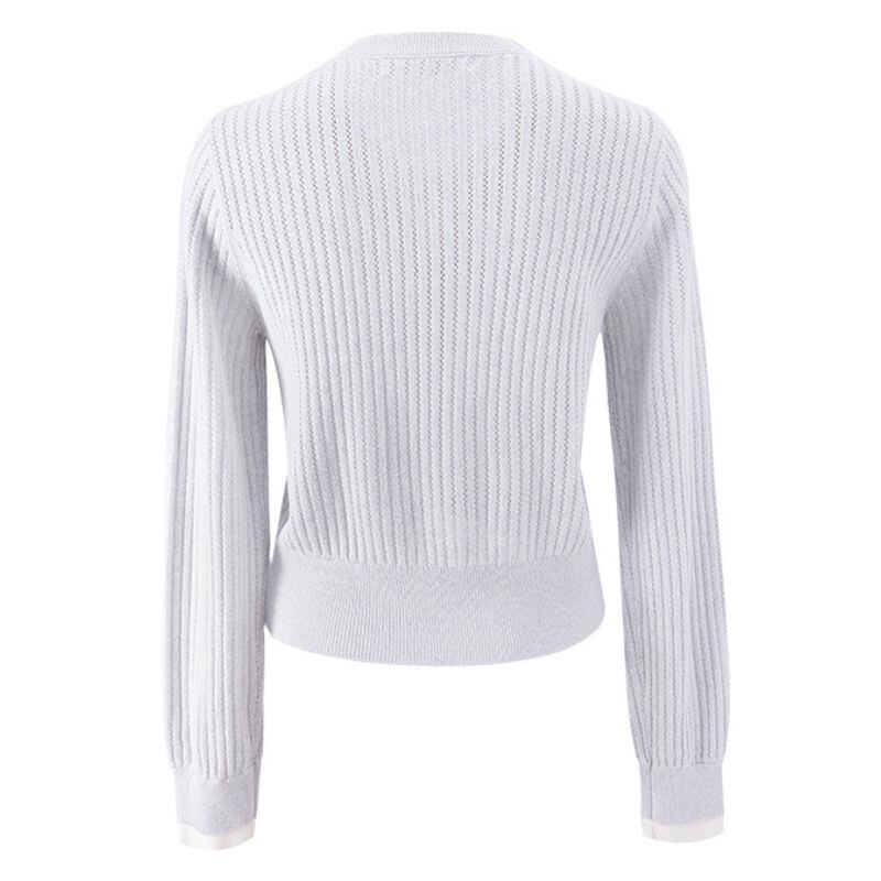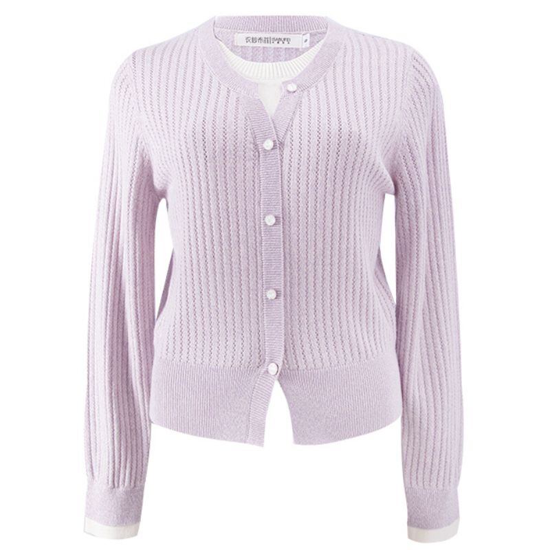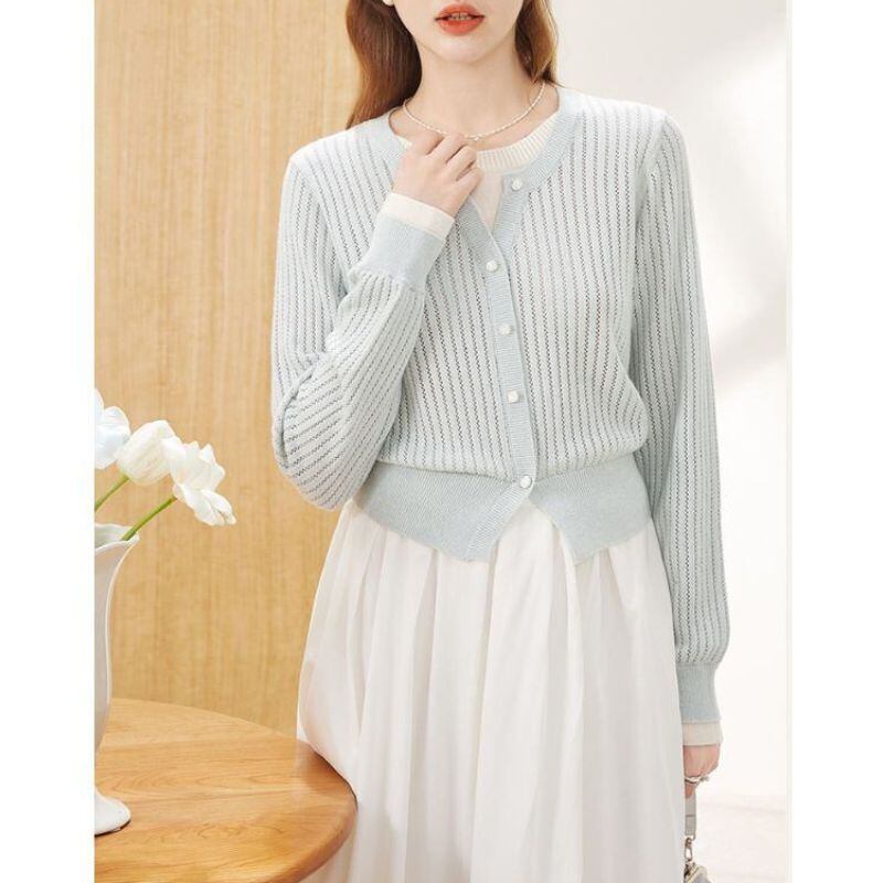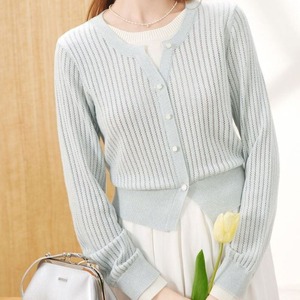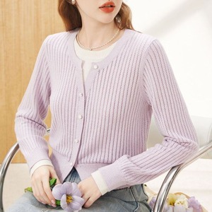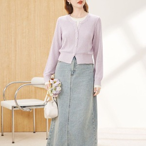 シンプルなリブ編みにパールボタンが映える、フェミニンなカーディガン。デニムと合わせればカジュアルに、スカートと合わせればきれいめコーデに。