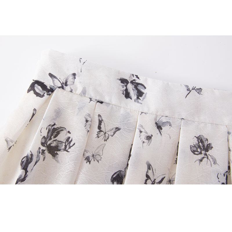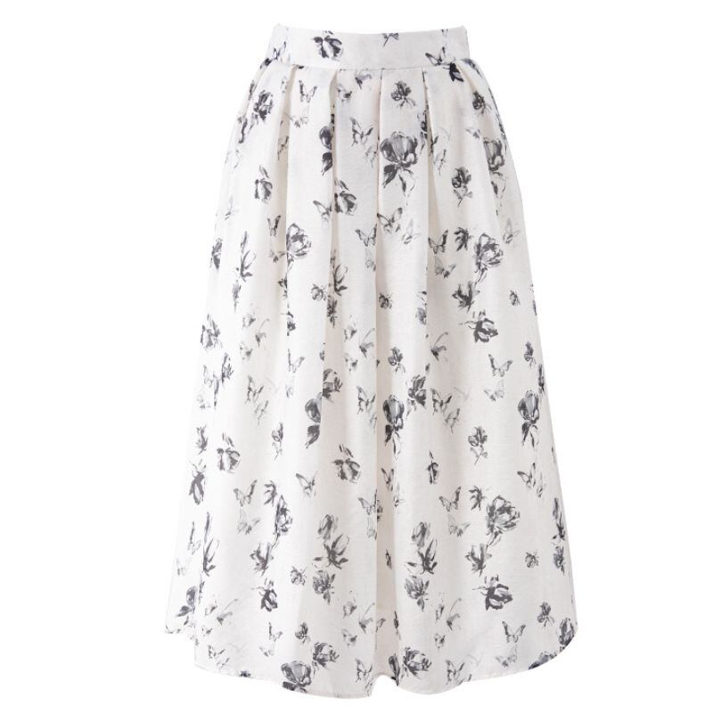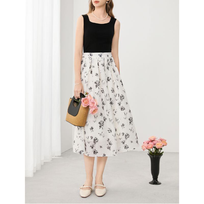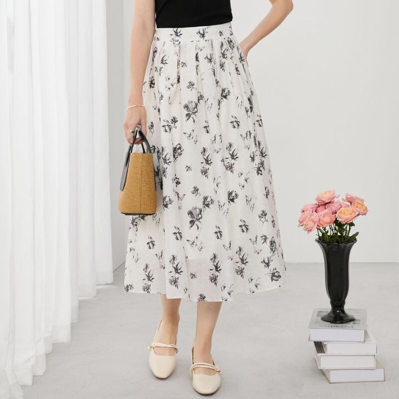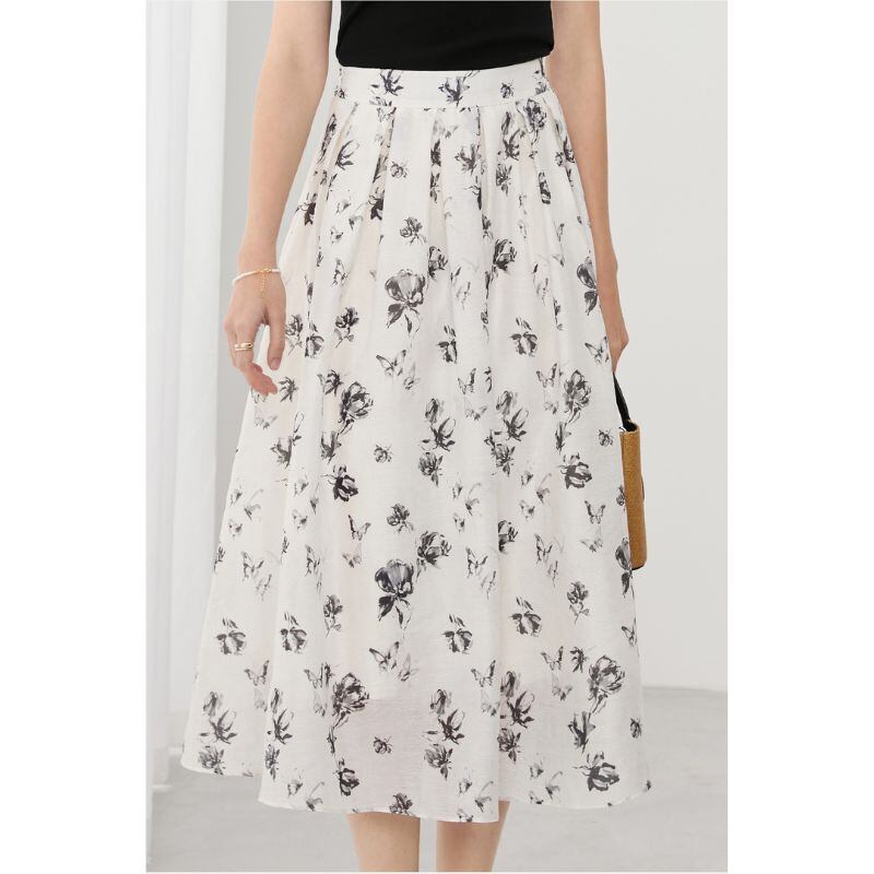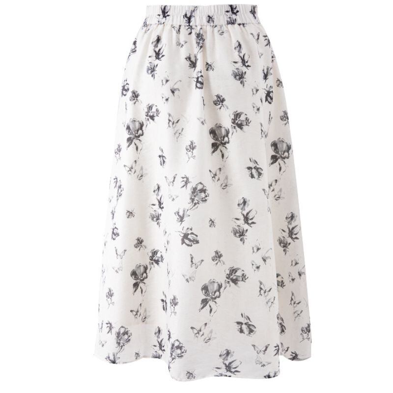 落ち着いた花柄プリントが上品な存在感を放つスカート。ふんわりと広がるシルエットと軽やかな揺れ感が、歩くたびに女性らしい華やぎを添えます。