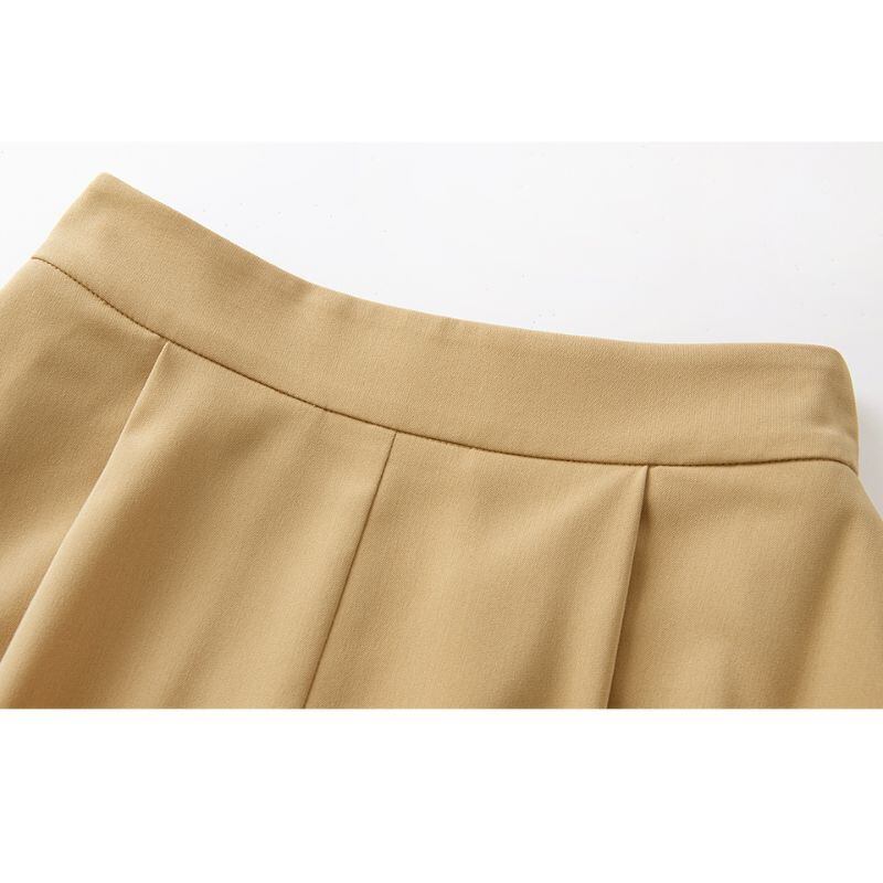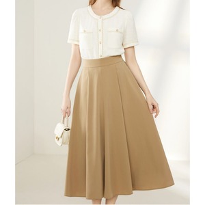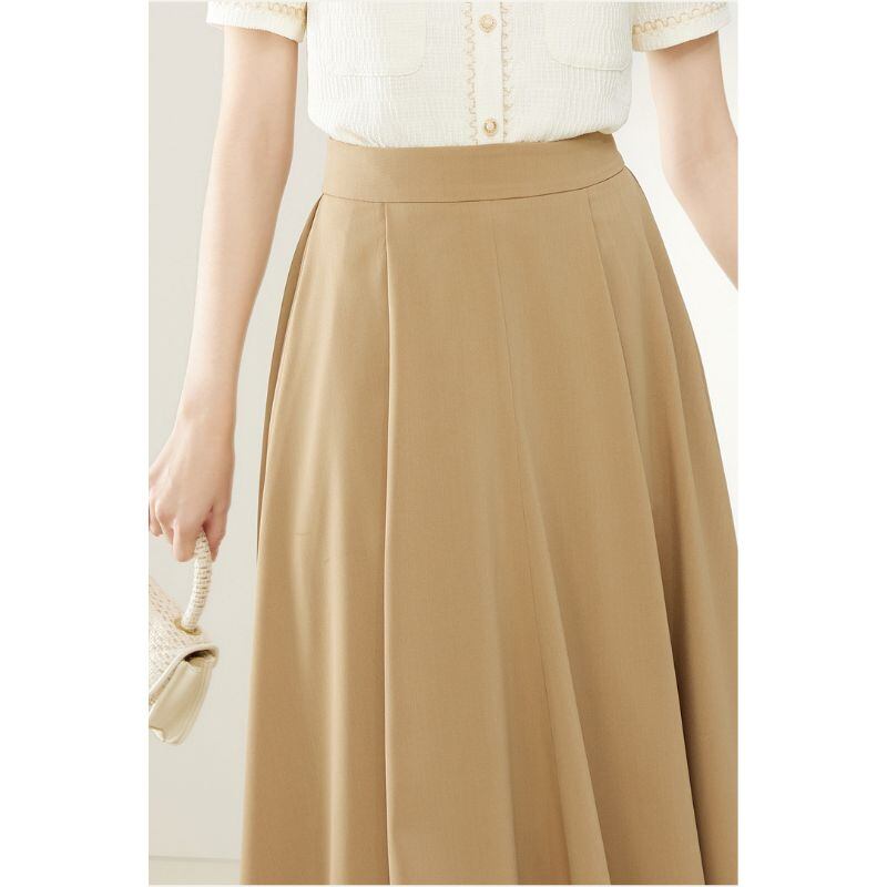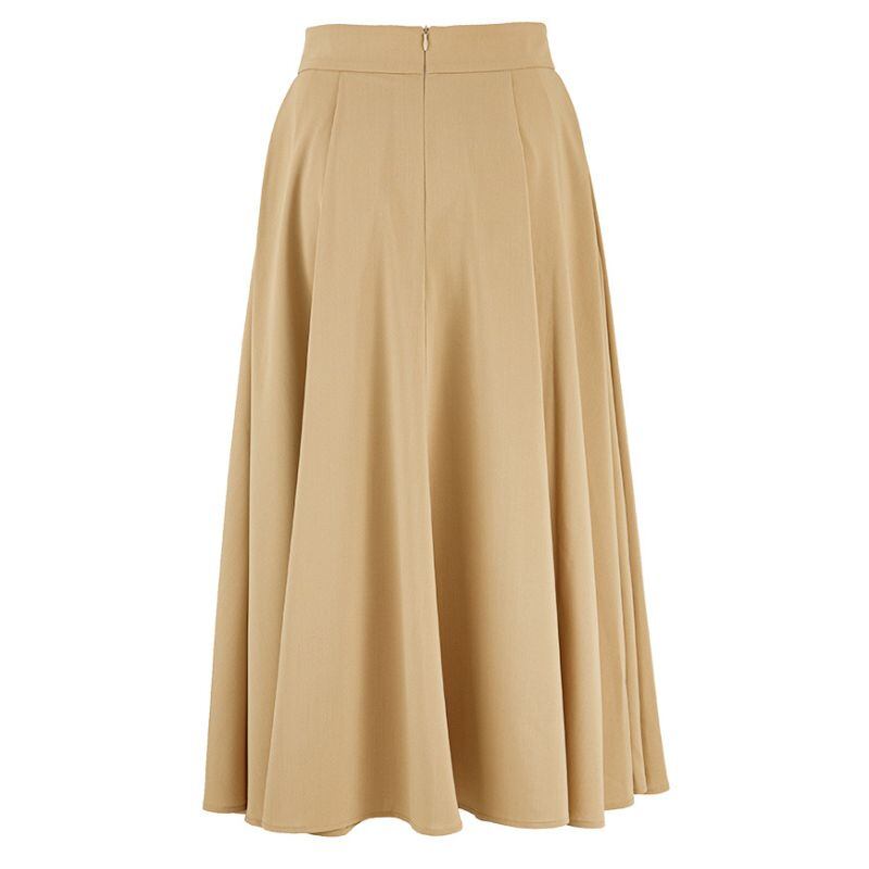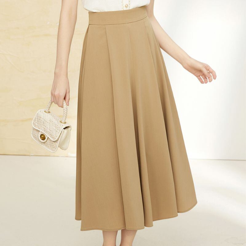 エレガントなフレアが美しく揺れるキャメルミディ丈スカート。落ち着いた色味でありながら、動くたびに上品な華やかさを演出します。