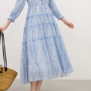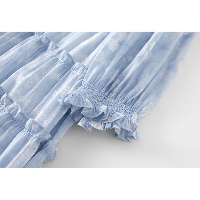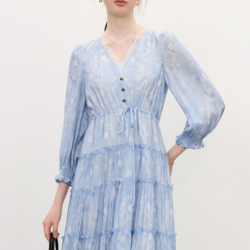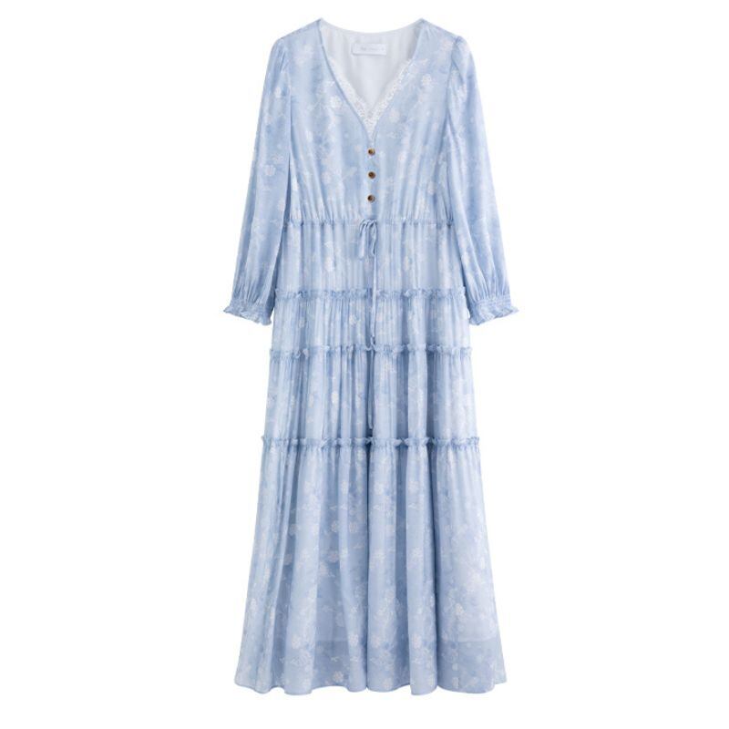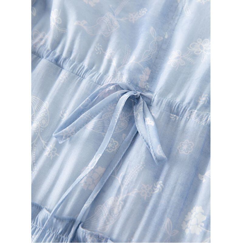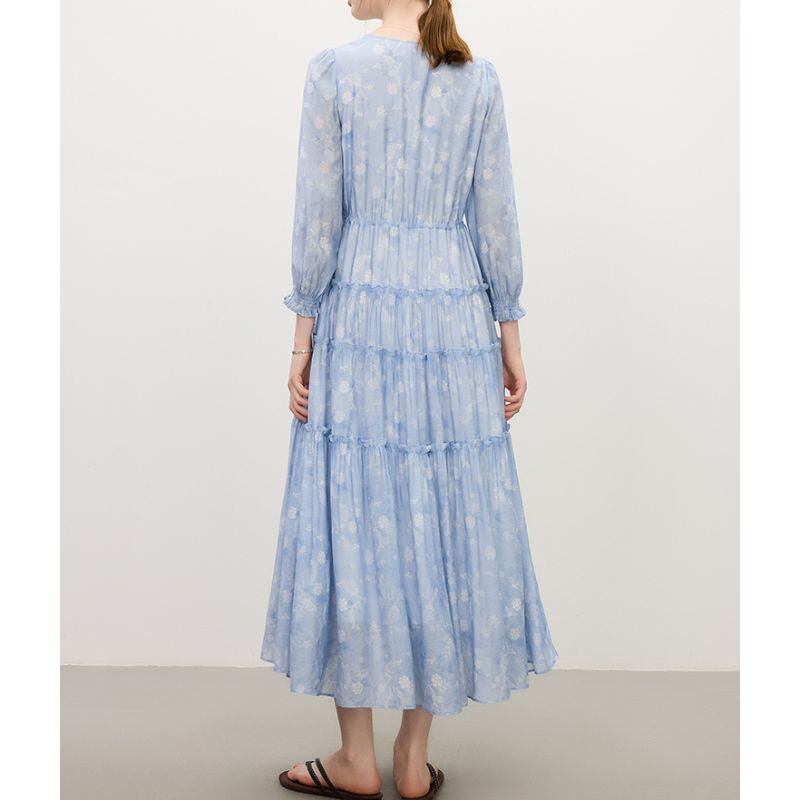 淡いブルーに小花柄をあしらった、清楚で可憐なティアードワンピース。段々の切り替えが立体感と動きを生み、歩くたびにふんわりと広がります。ウエスト部分はさりげない絞りデザインで、スタイルアップ効果も。休日のお出かけから旅行まで、様々なシーンで活躍する一枚です。