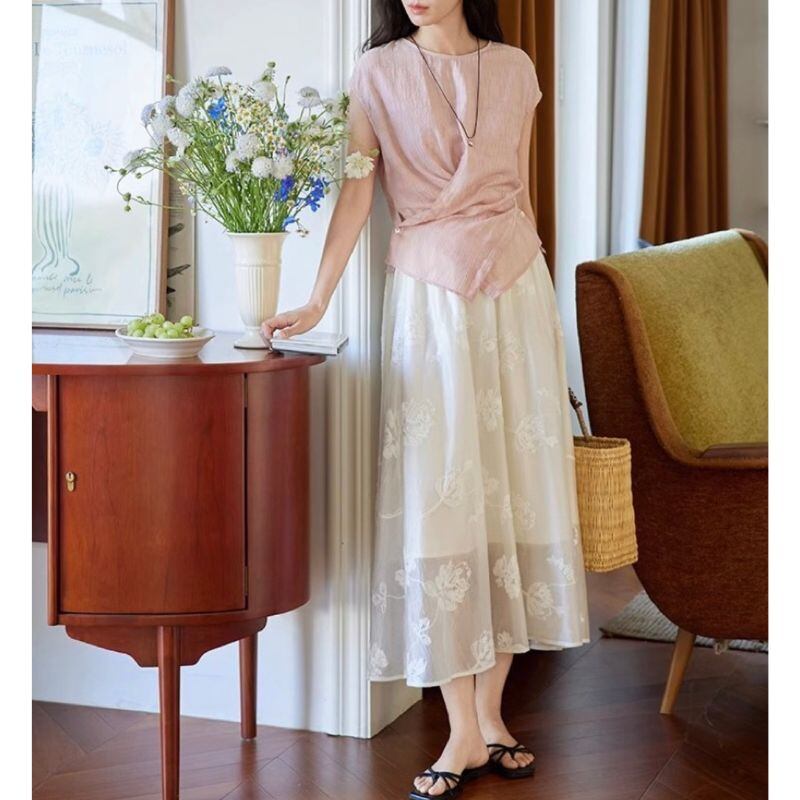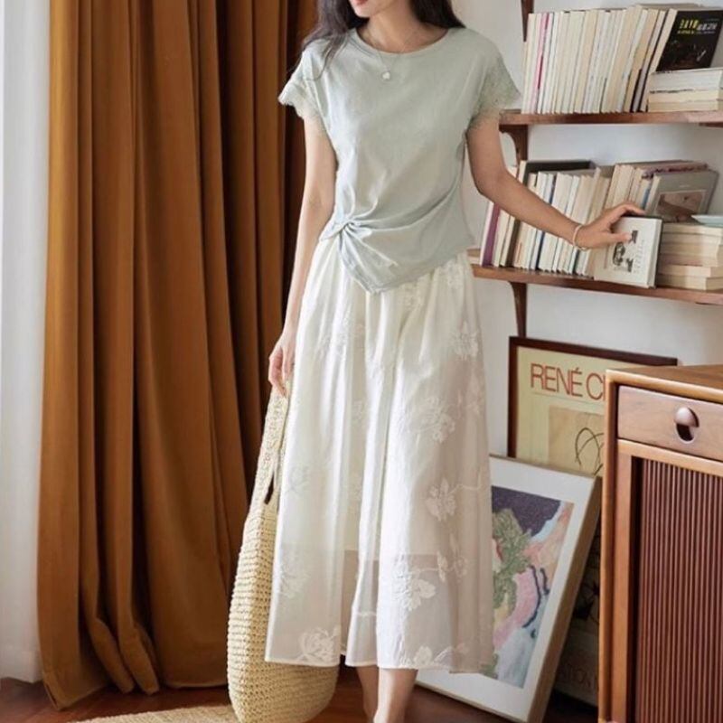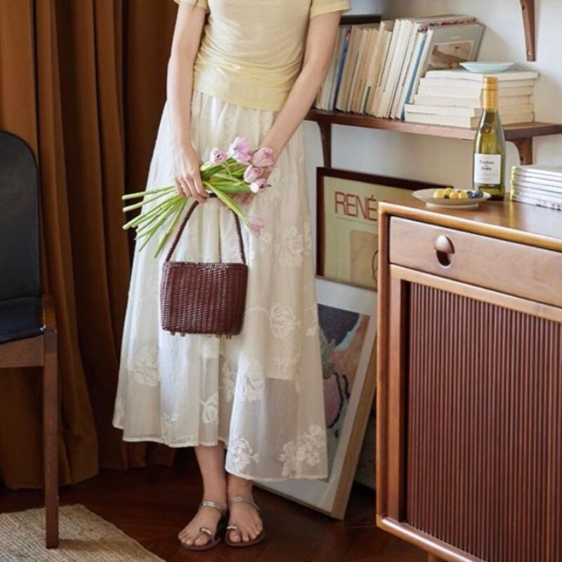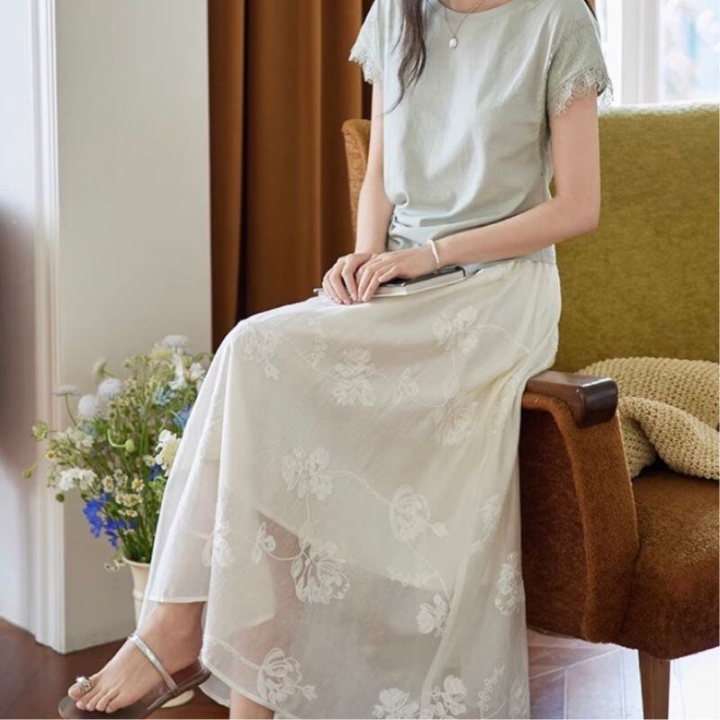 Aラインシルエットが女性らしいロングスカート。繊細な刺繍が、さりげないアクセントになっています。シンプルなトップスと合わせるだけで、上品で洗練された印象に。普段使いはもちろん、ちょっとしたお出かけにもおすすめです。