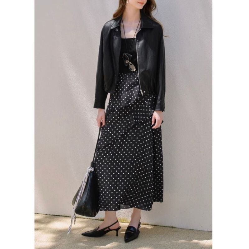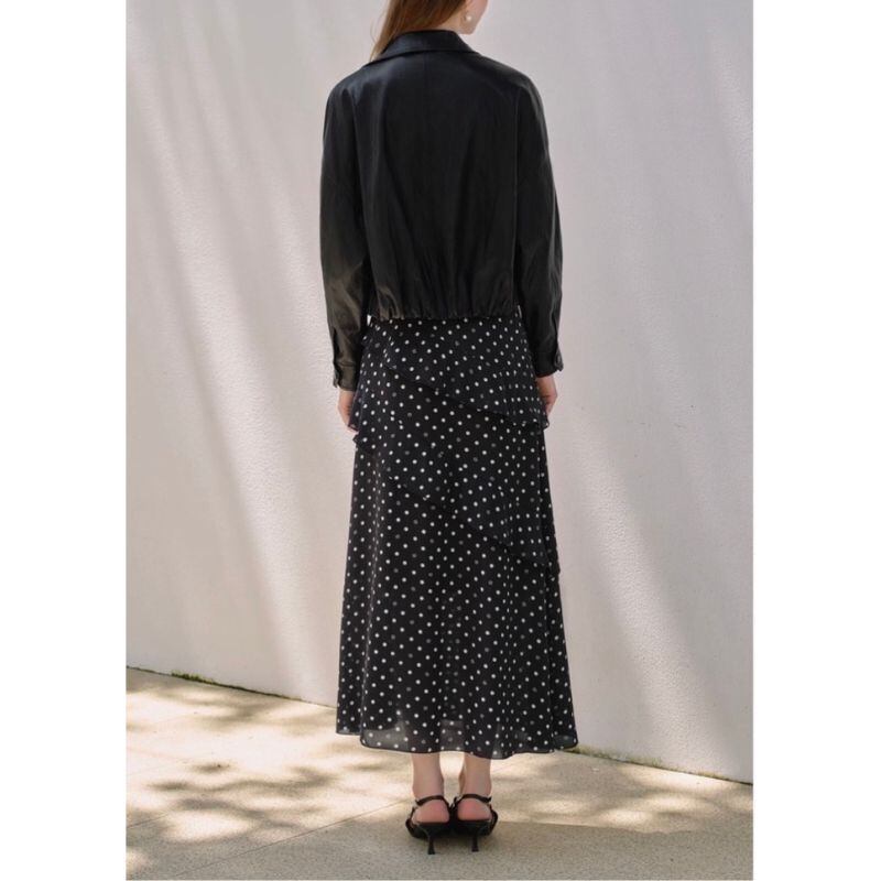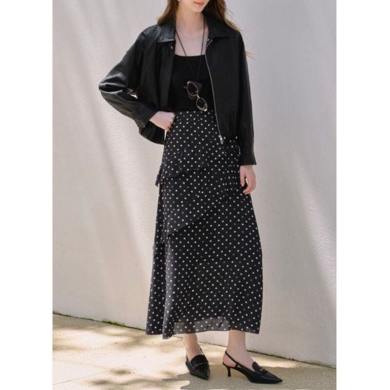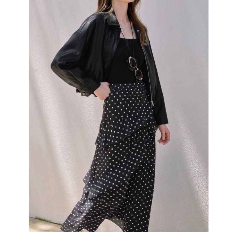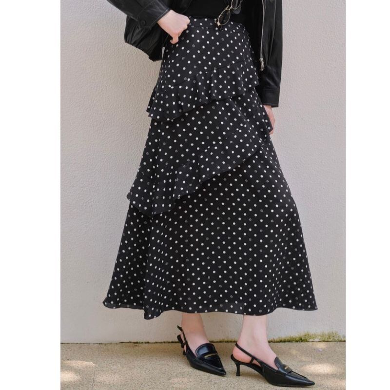 ドット柄と斜めに重なるフリルが、動くたびに華やかさを演出するアシンメトリースカート。シンプルなトップスと合わせるだけで、大人可愛いスタイルが完成します。デイリーからお出かけまで幅広く活躍する一枚です。