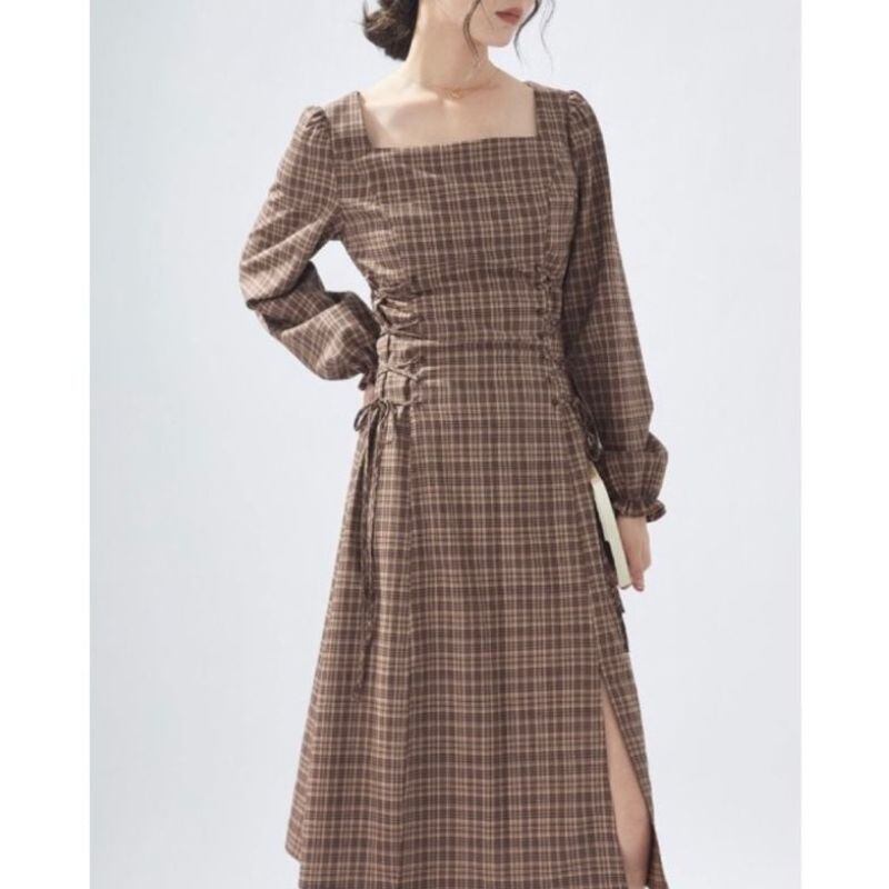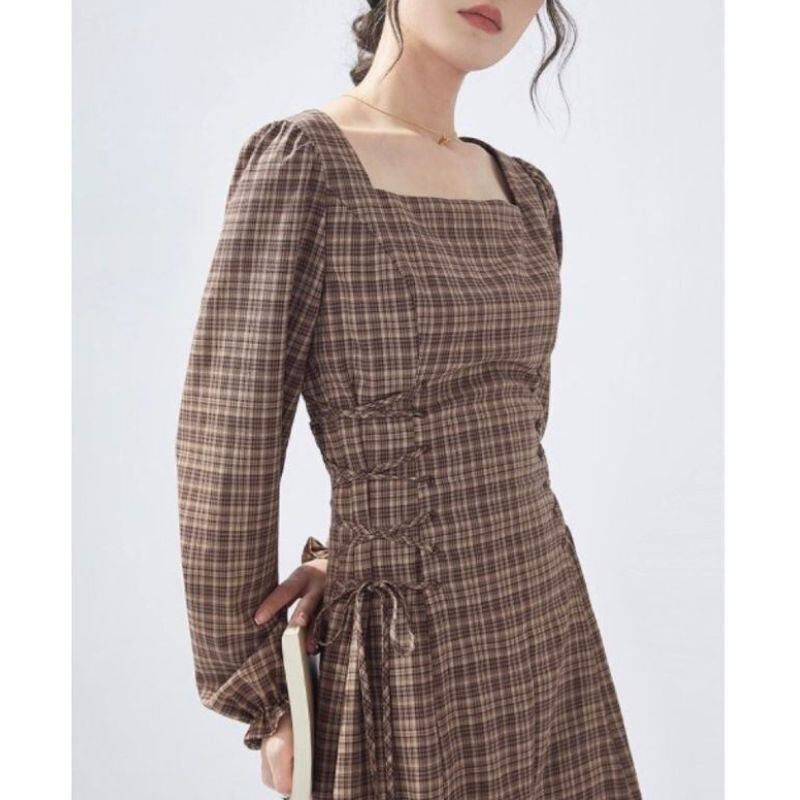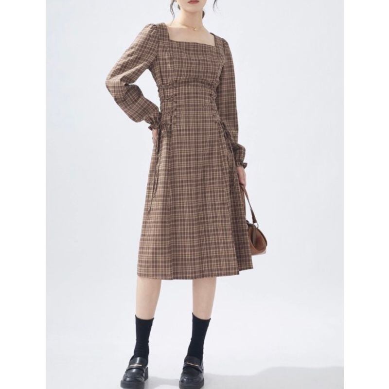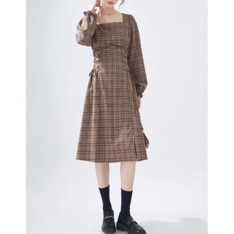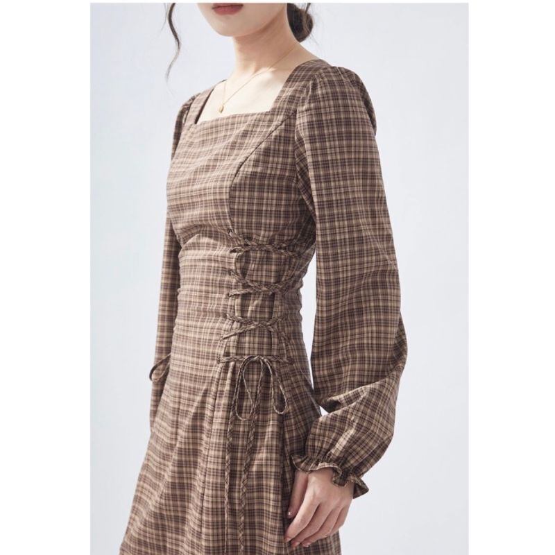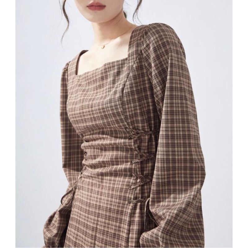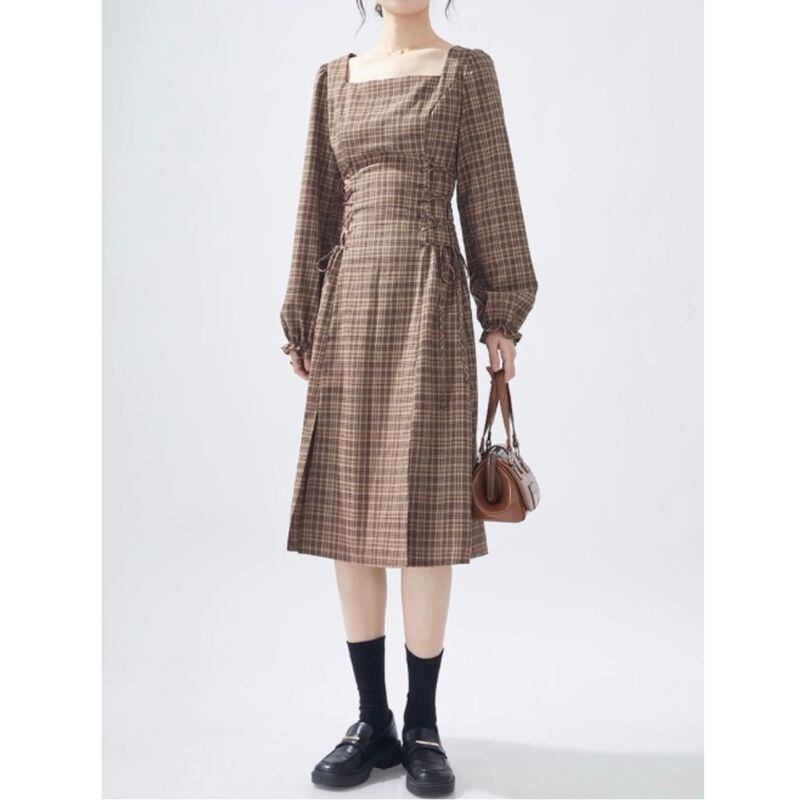 落ち着いたブラウンチェック柄に、サイドのレースアップが女性らしいアクセントを添えるワンピース。スクエアネックがデコルテをすっきりと見せ、ウエストラインを美しく引き立てます。ブーツやパンプスと合わせて、秋冬コーデの主役に。