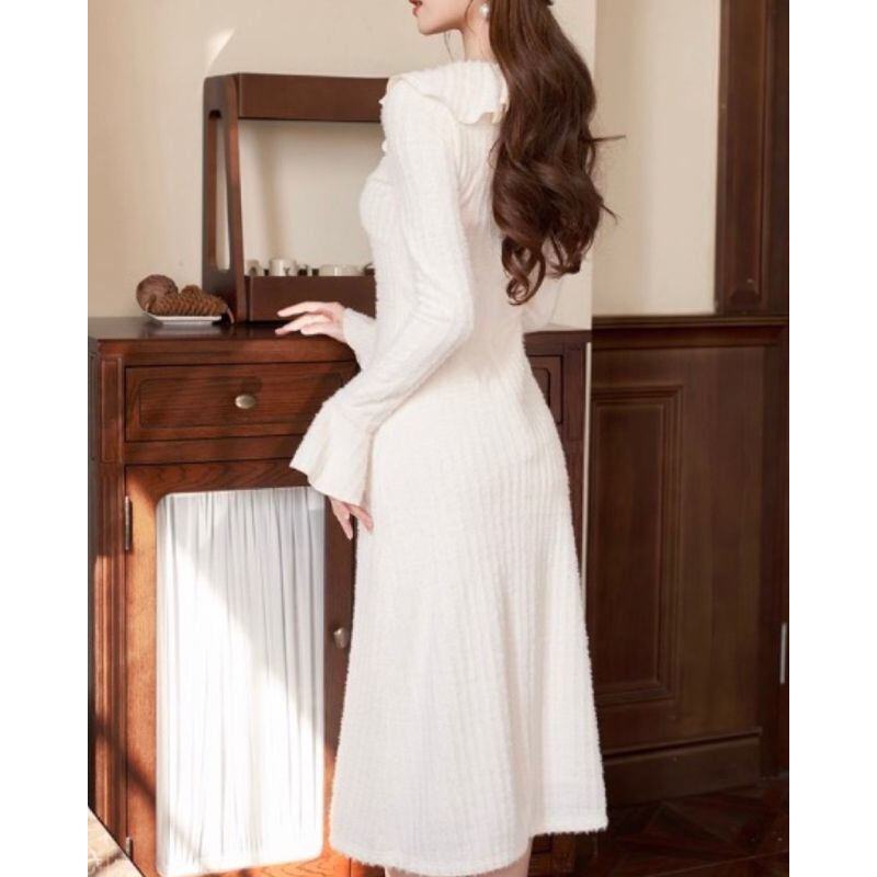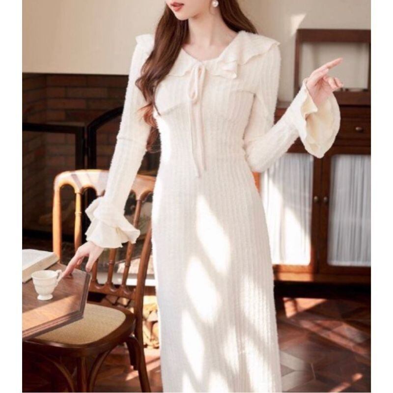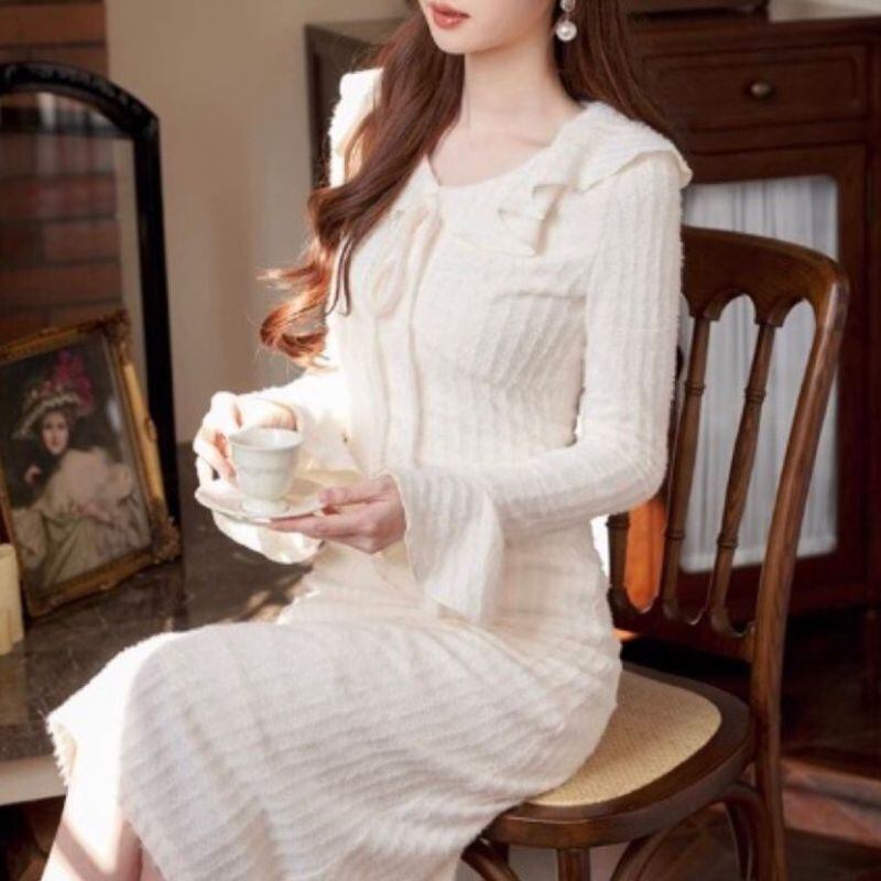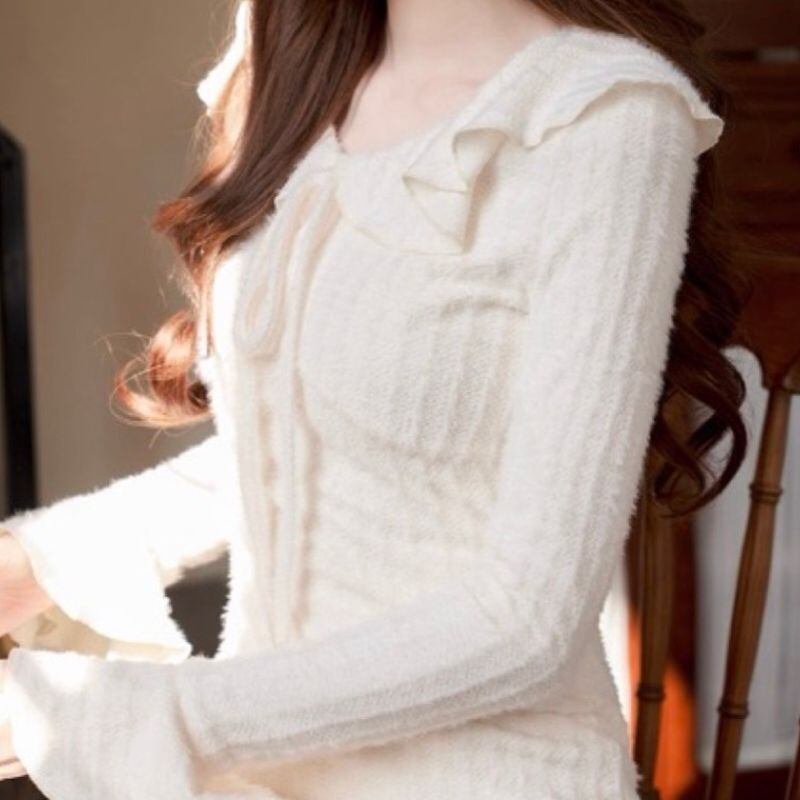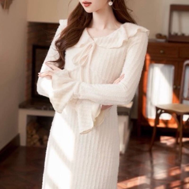 柔らかなフリルカラーと胸元のリボンが視線を惹きつけるニットワンピース。縦ラインを強調するリブ編み風の表情が、すっきりとしたシルエットを演出します。袖口のフレアがさりげなく可憐さをプラス。デートやお食事会など、上品に装いたいシーンにおすすめの一着です。