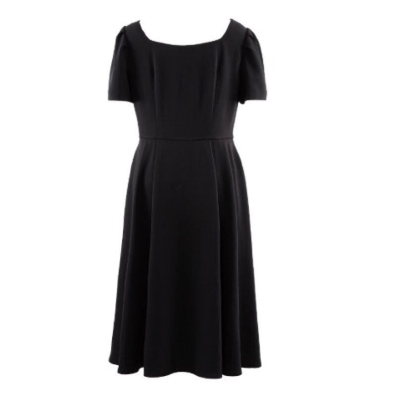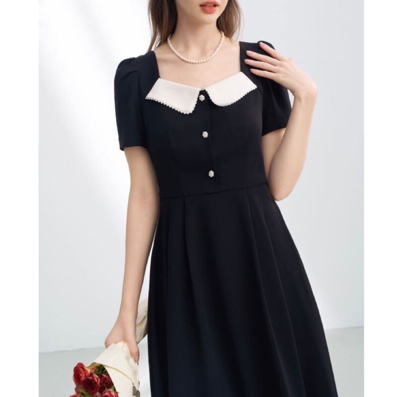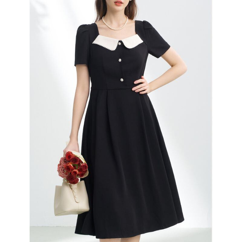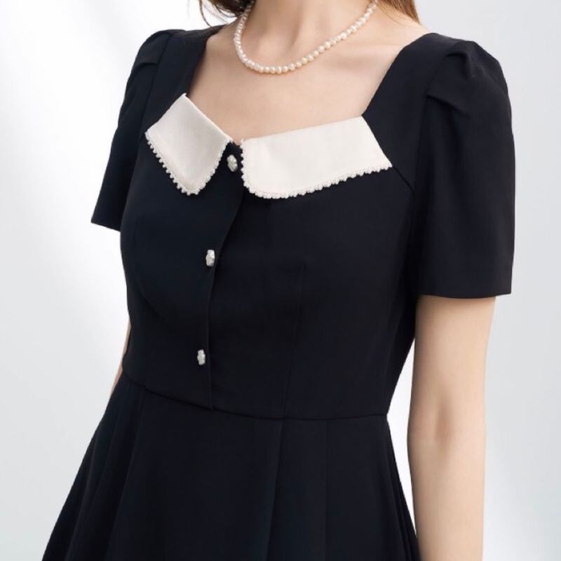 スカラップ仕立ての襟元とパール調ボタンが上品に映えるバイカラーワンピース。フィット&フレアの美しいシルエットが、女性らしさを引き立てます。シンプルながらもディテールにこだわったデザインで、フォーマルからデートシーンまで幅広く活躍する一着です。