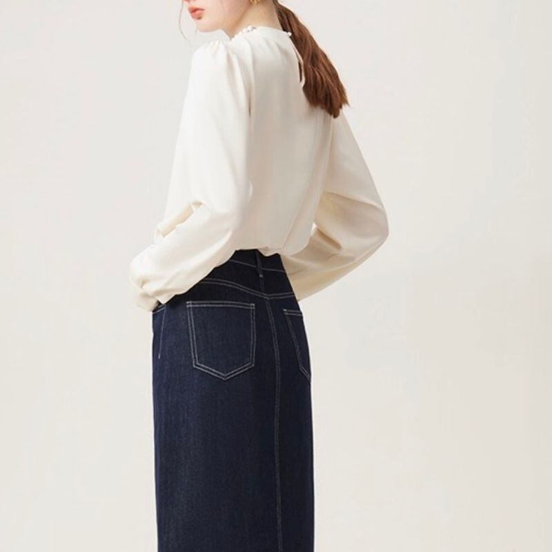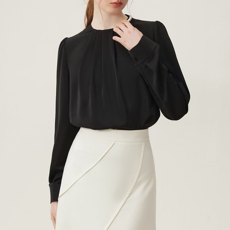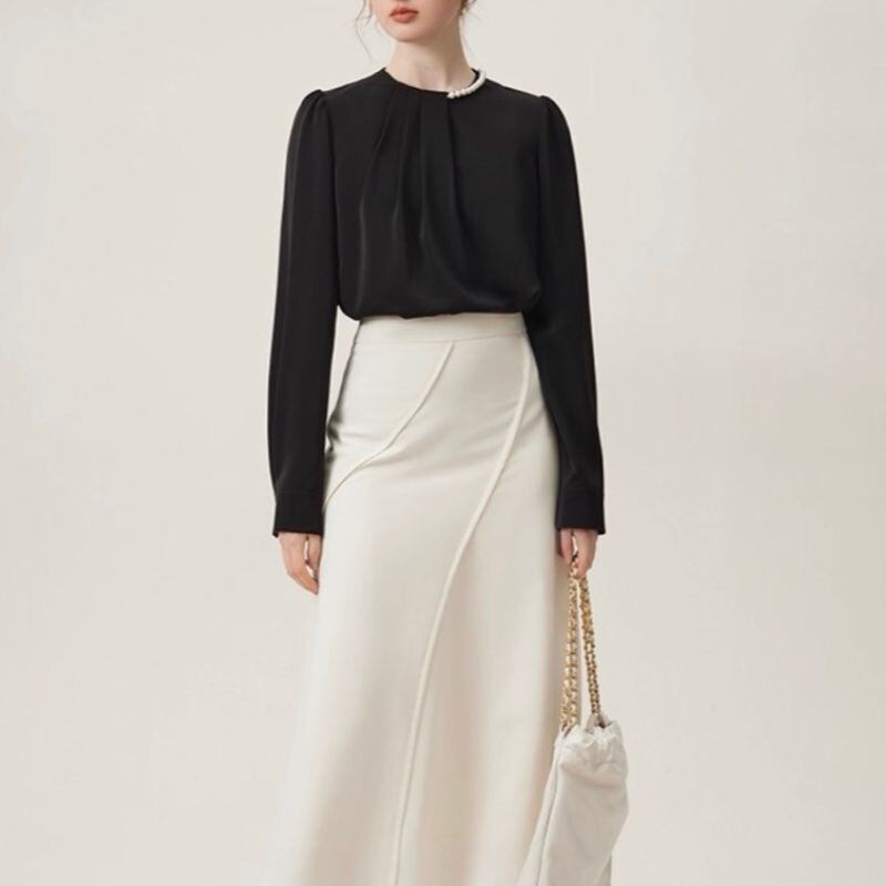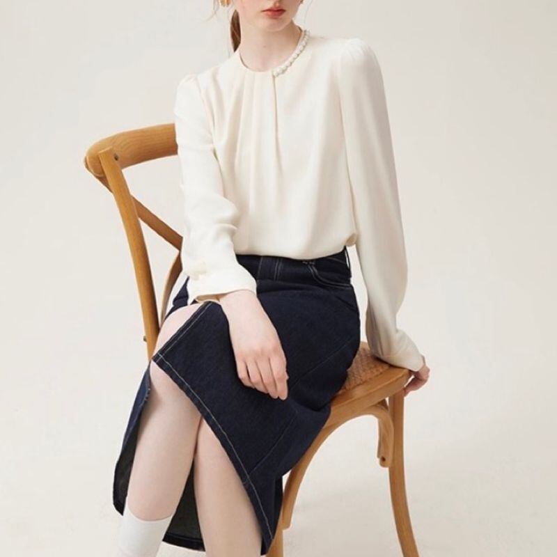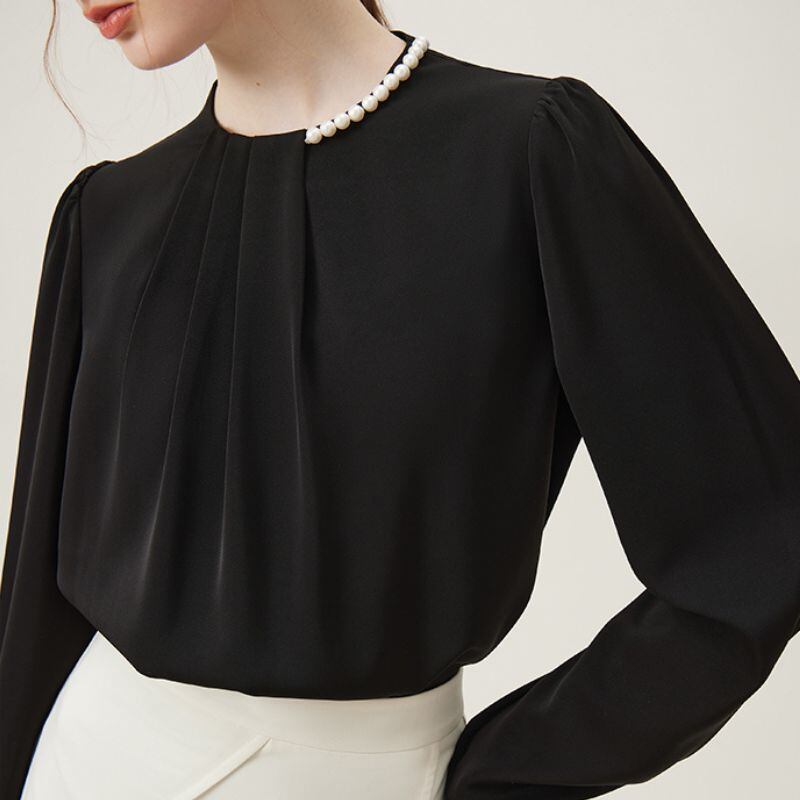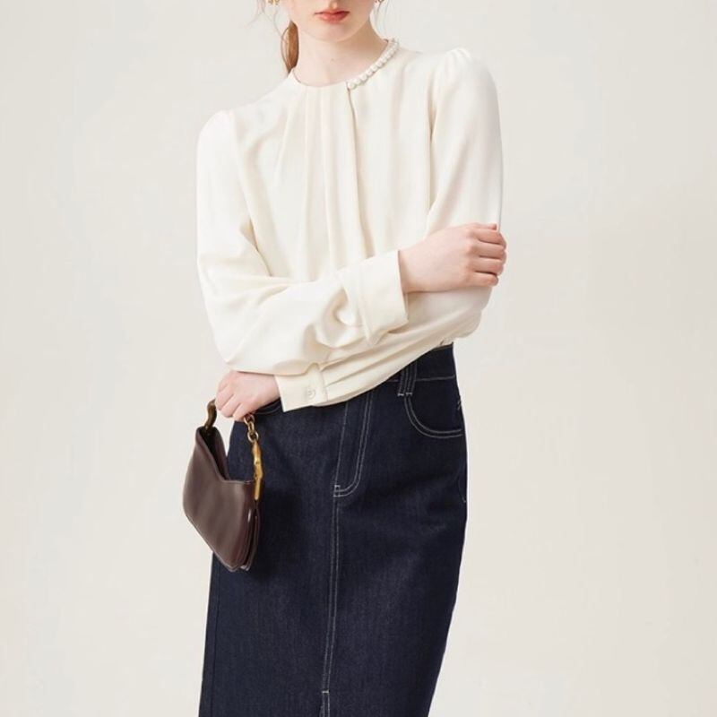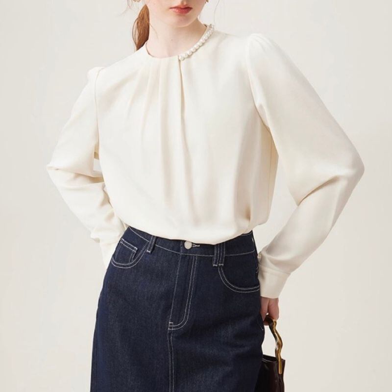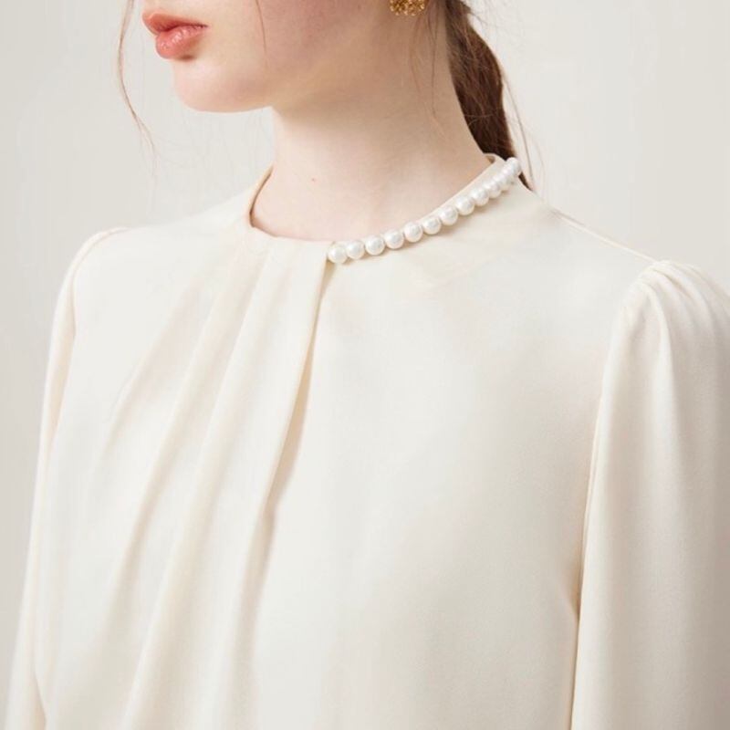 繊細なパールが首元を飾る、上品なホワイトブラウス。フロントに施されたタックデザインが立体感を生み、ふんわりとしたシルエットを演出します。シンプルながらも洗練された印象で、オフィスからデートシーンまで幅広く活躍。スカートにもパンツにも合わせやすく、大人フェミニンな着こなしを叶える一枚です。
