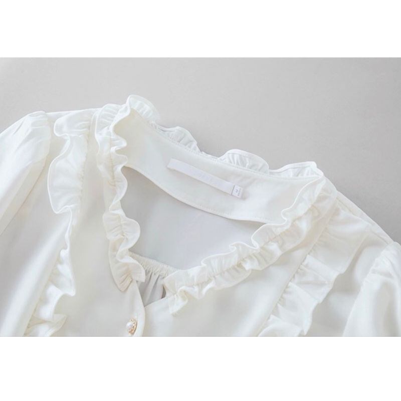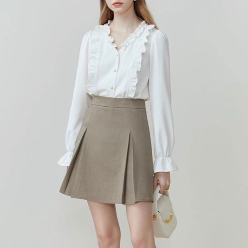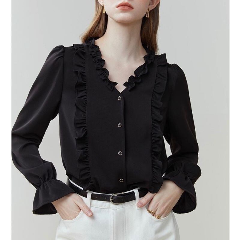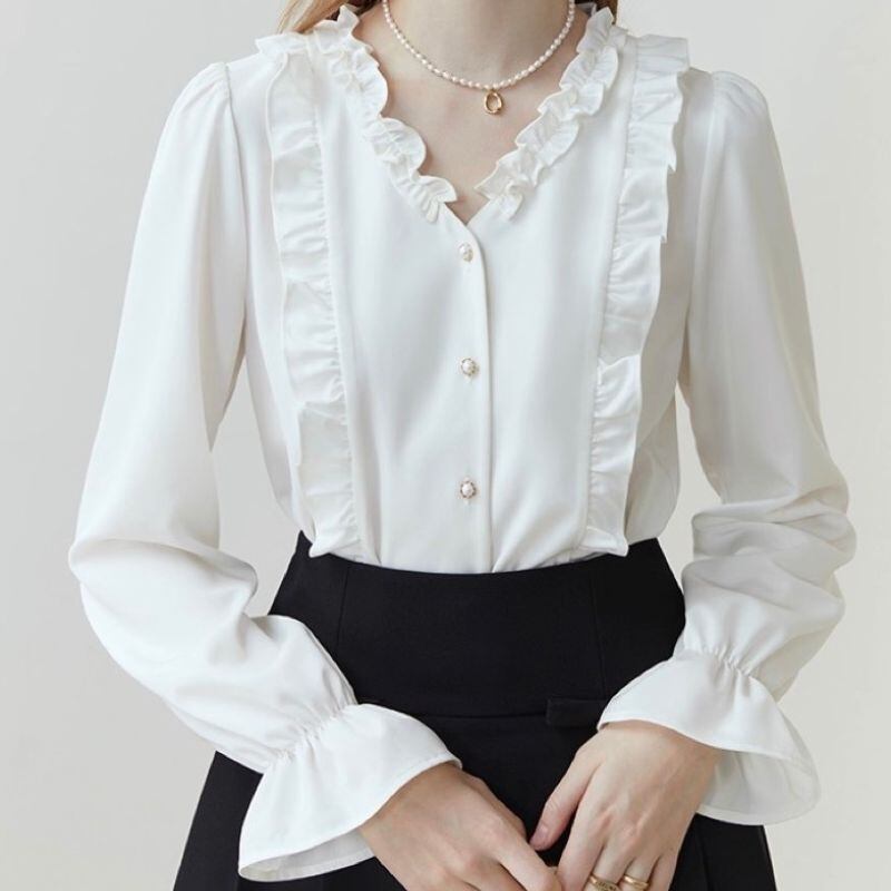Vネックとフリルディテールがフェミニンなブラウスです。ロングスリーブのデザインで、オフィスにも、カジュアルなシーンにも着回しやすく、上品な印象を与えます。シンプルなボトムスと合わせるだけで、洗練されたコーディネートが完成します。