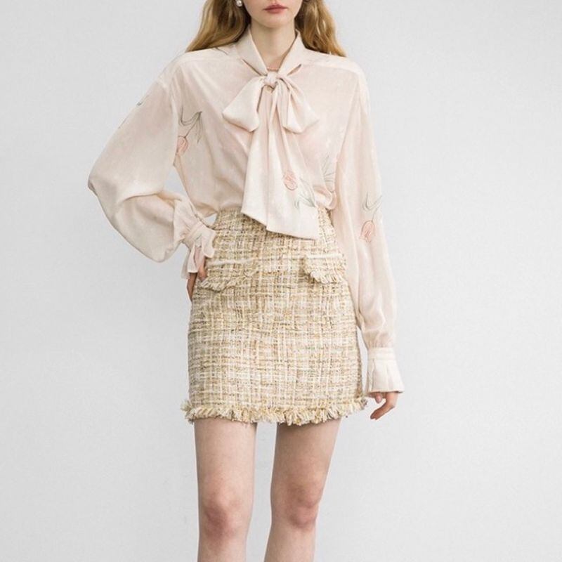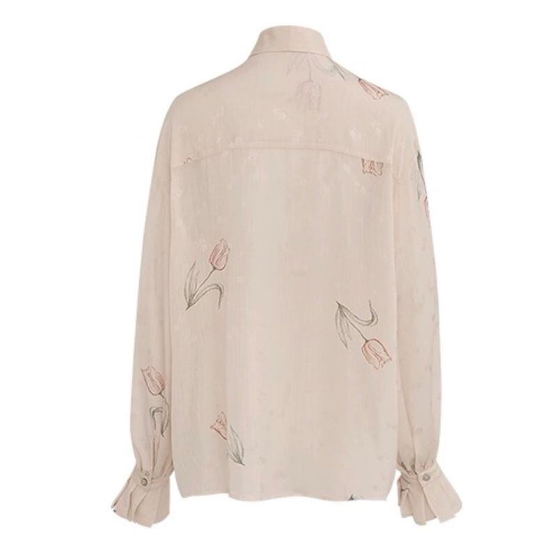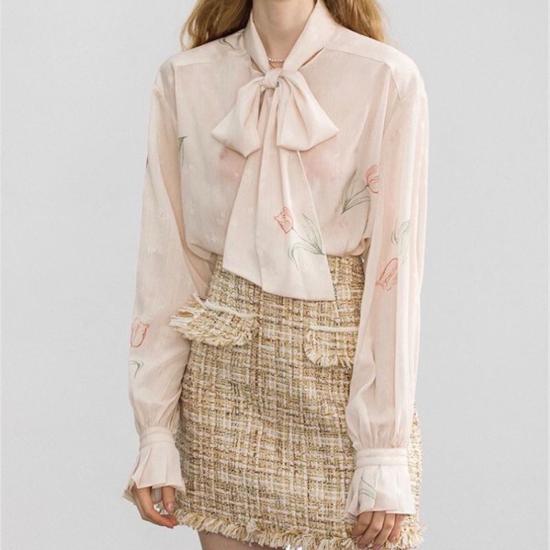繊細なフラワープリントと存在感のあるボウタイリボンが印象的なブラウス。