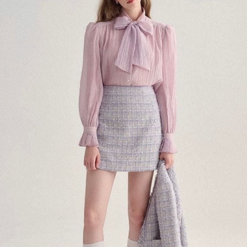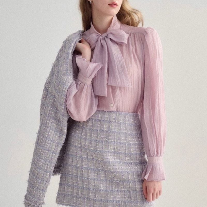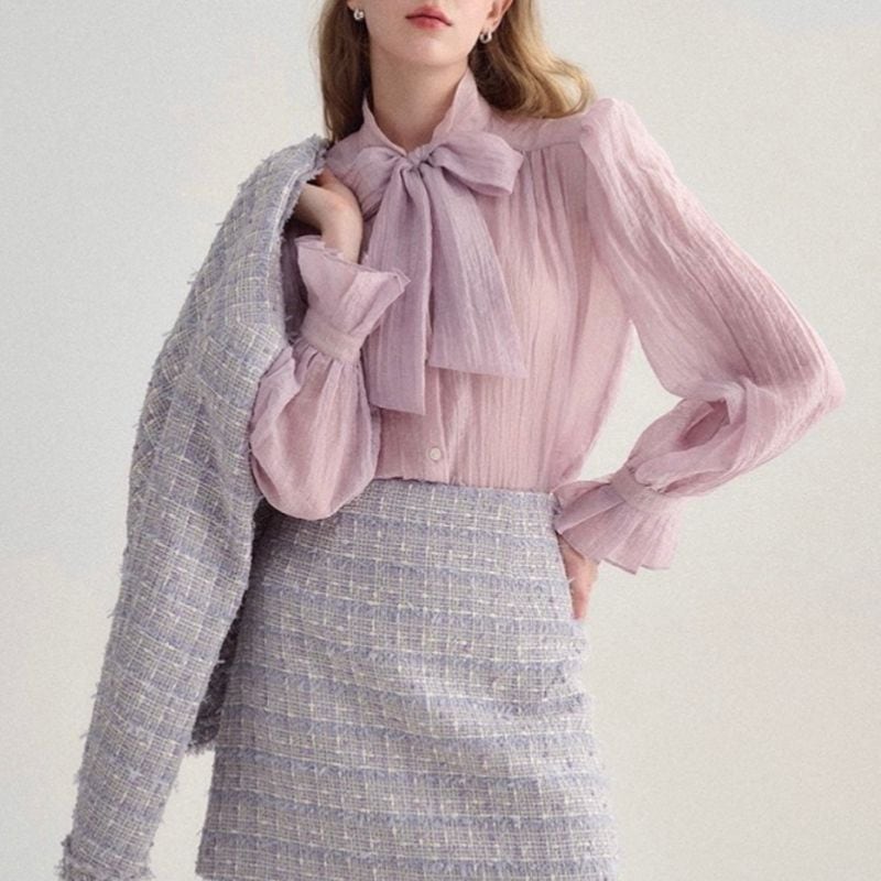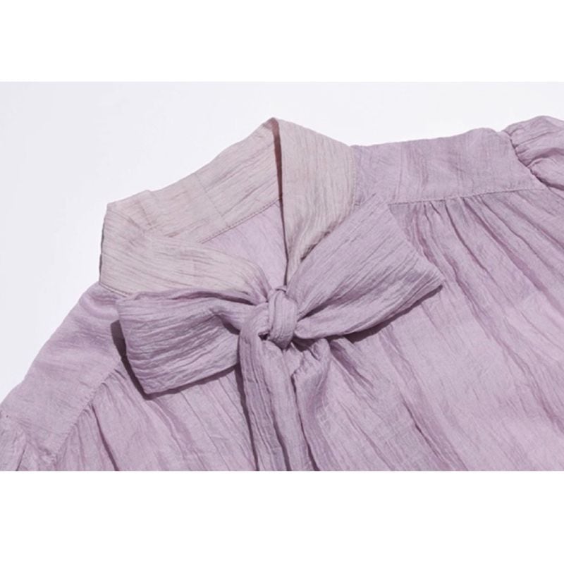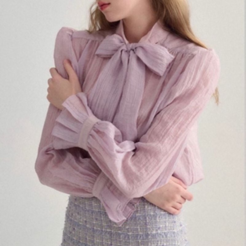 ふんわりとしたシアー素材に大きめのリボンが映え、クラシカルで女性らしい印象を演出します。袖口にはギャザーを寄せ、ほどよいボリューム感をプラス。
