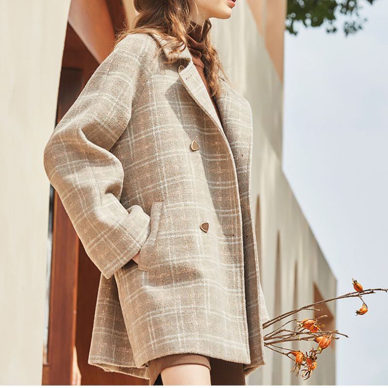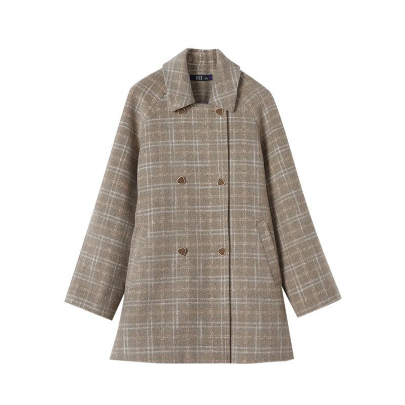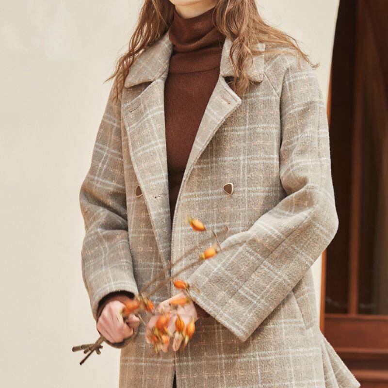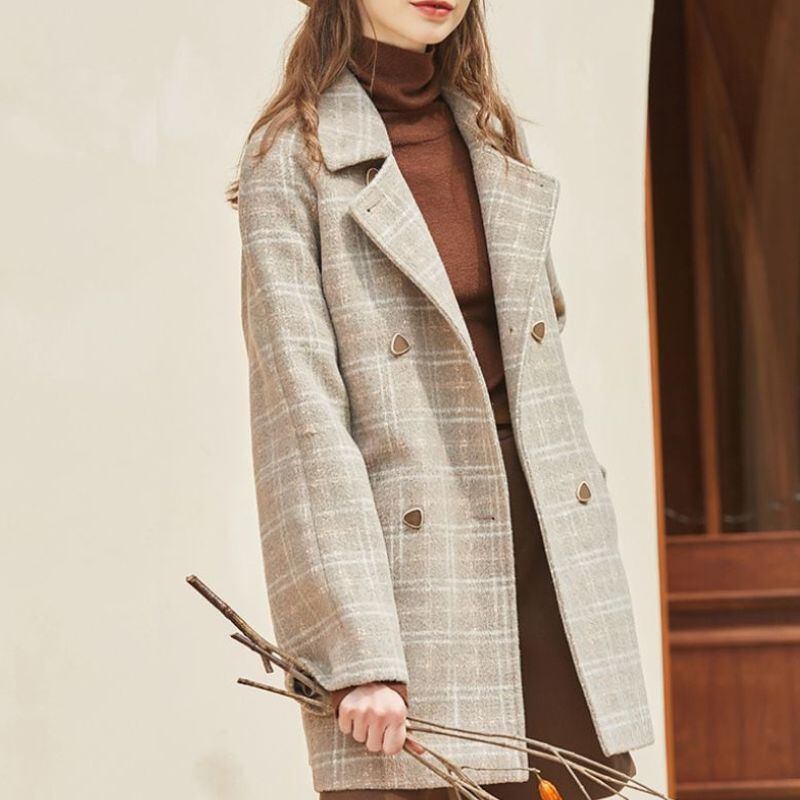 落ち着いたトーンのチェック柄が上品な雰囲気を演出するダブルブレストコート。