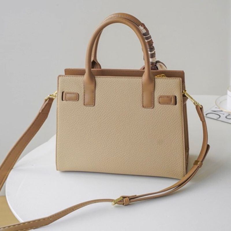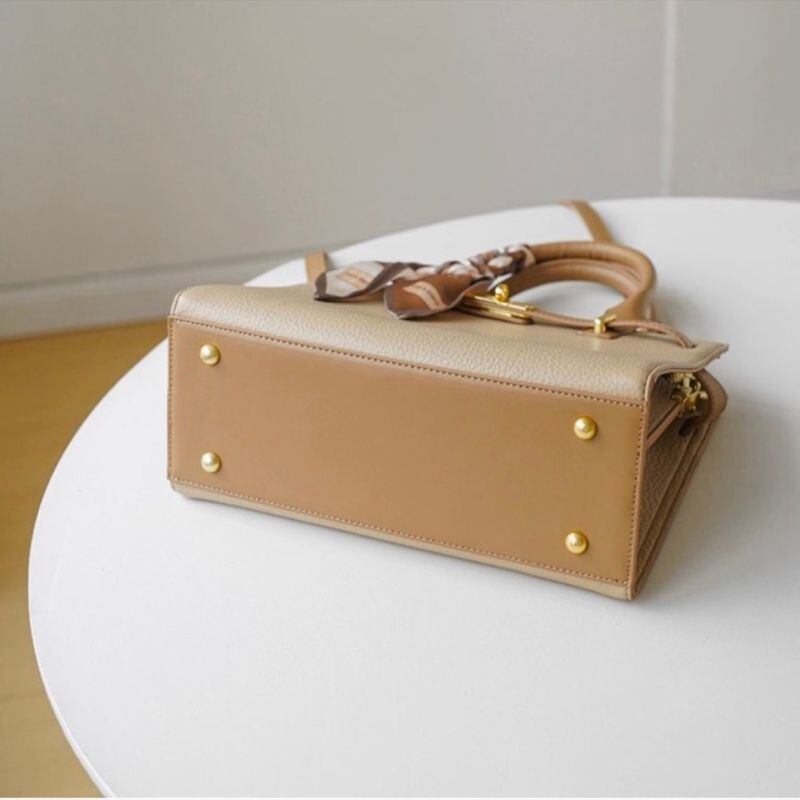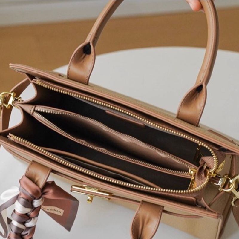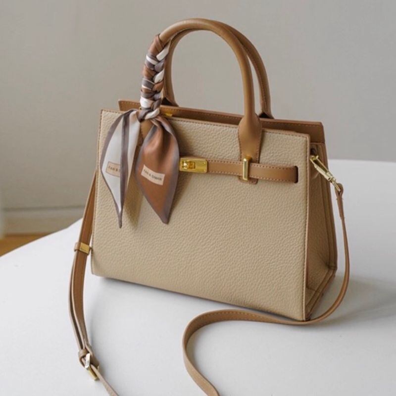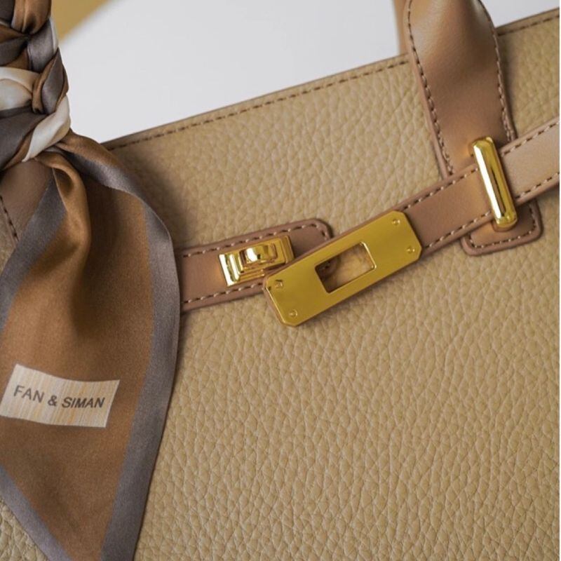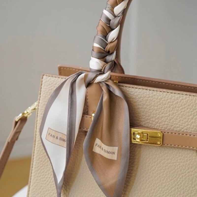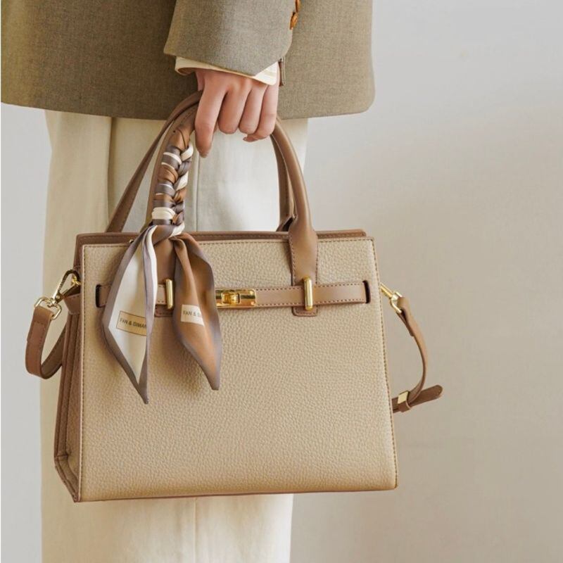 上品なシルエットに華やかなスカーフが映える、洗練されたデザインバッグ。