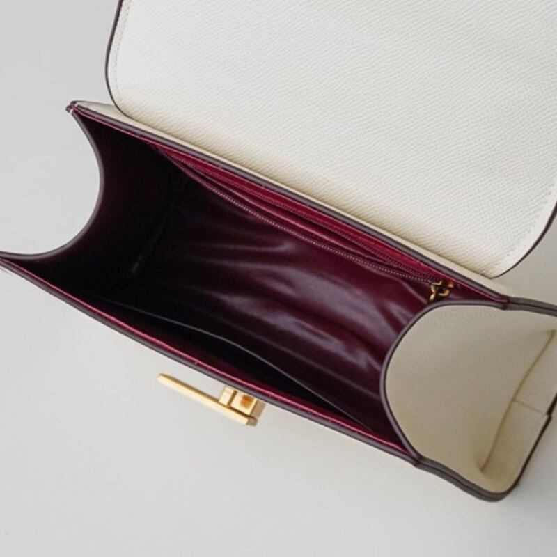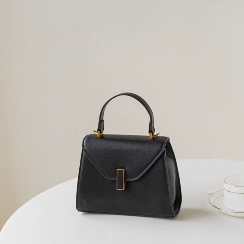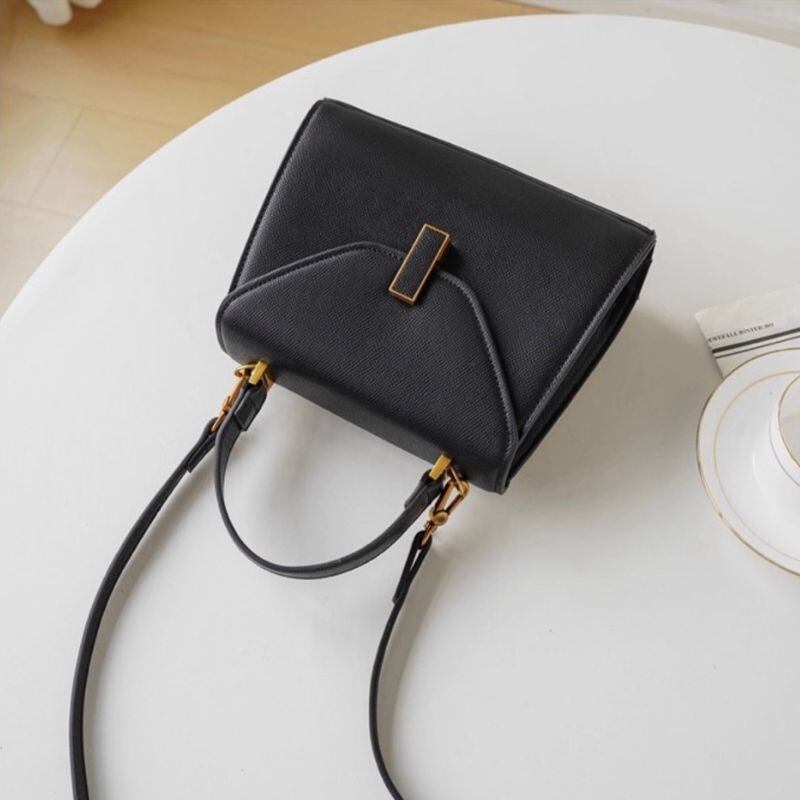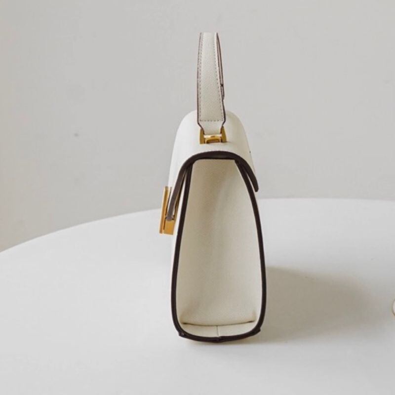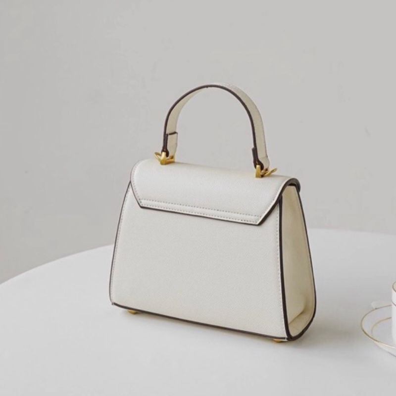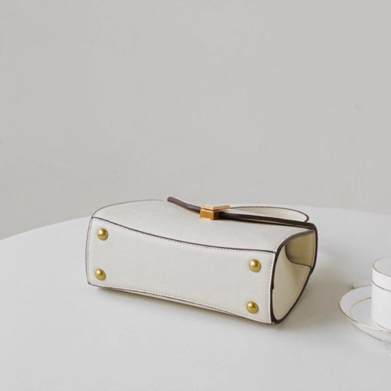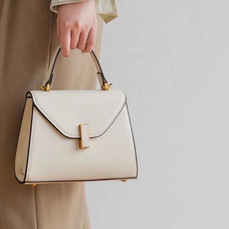 上品なスクエアシルエットにゴールドのアクセントを効かせたハンドバッグ。