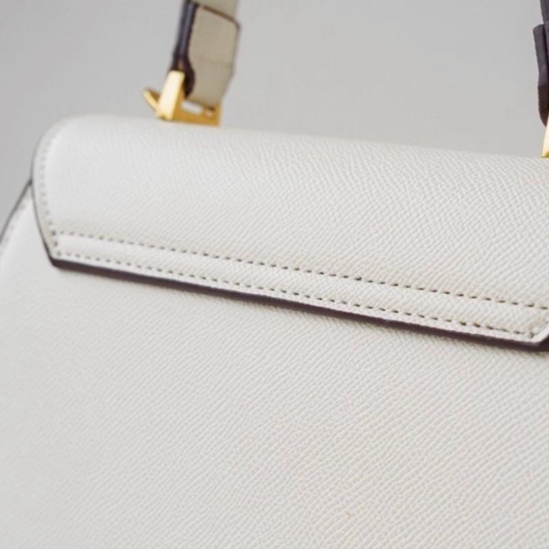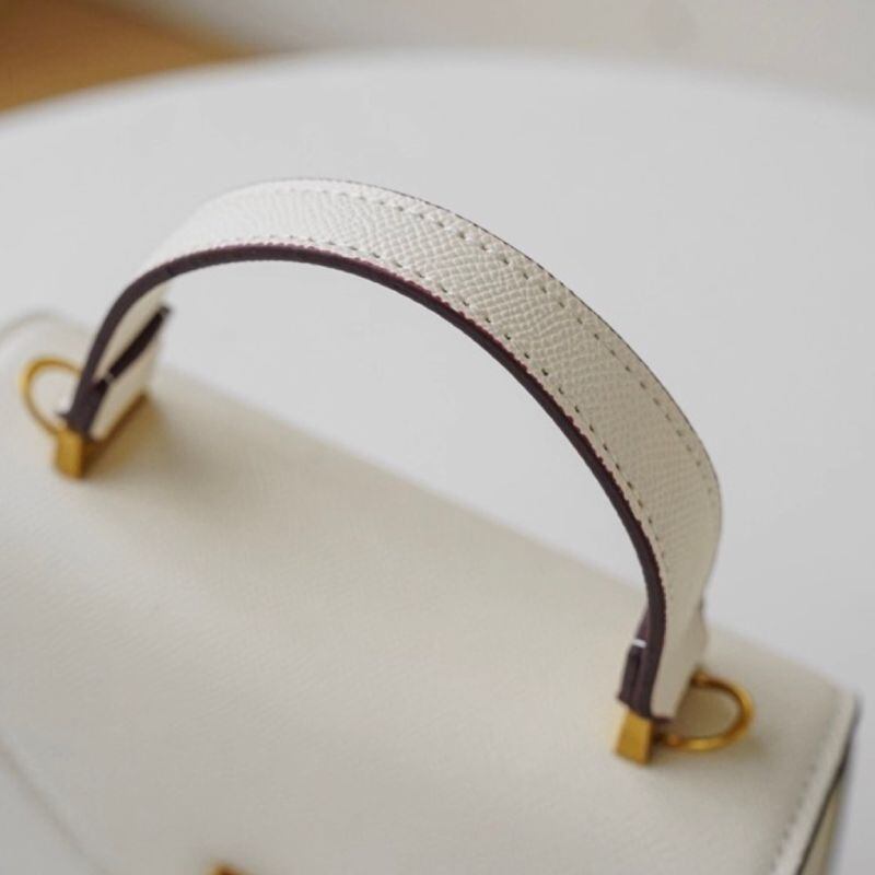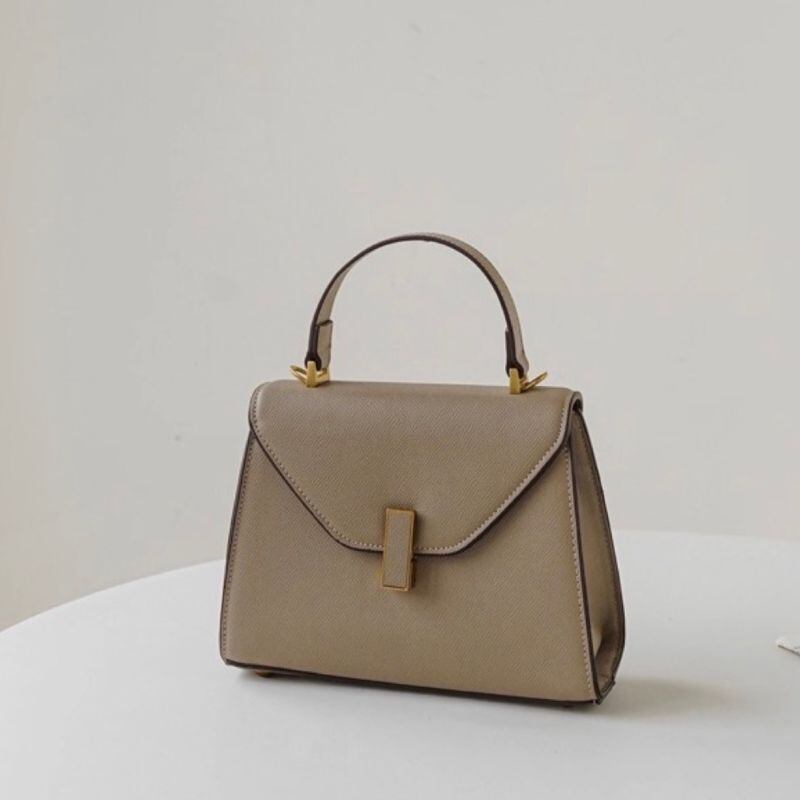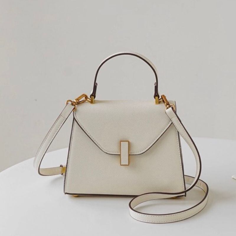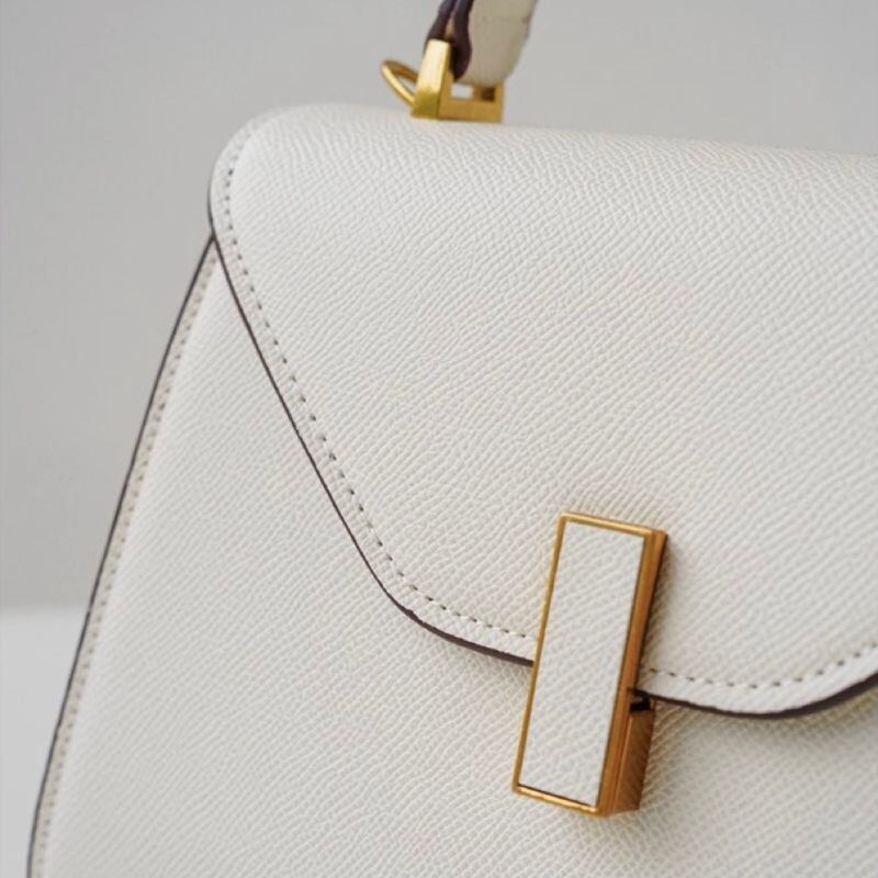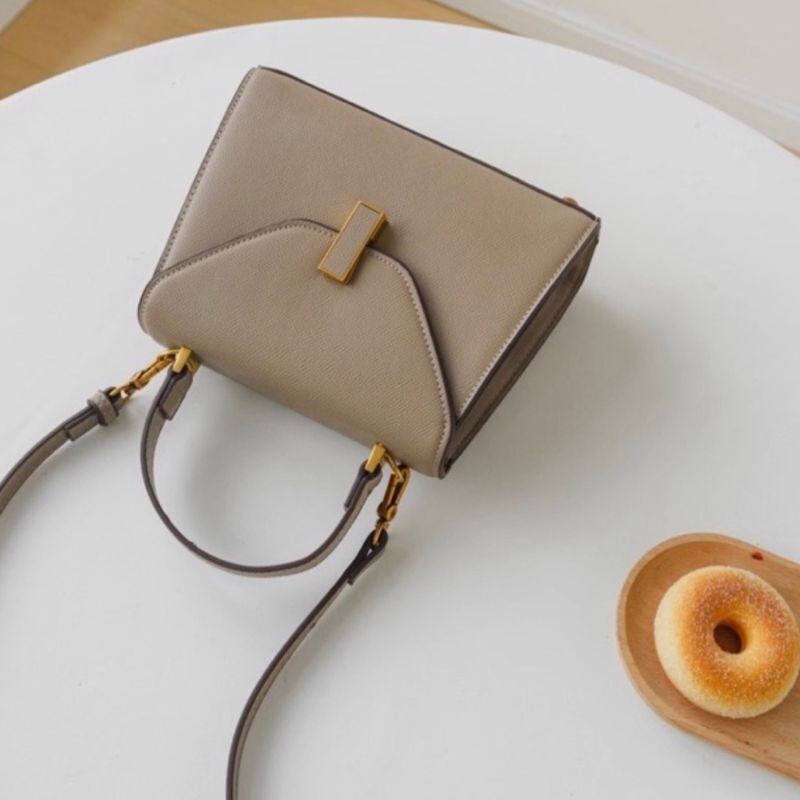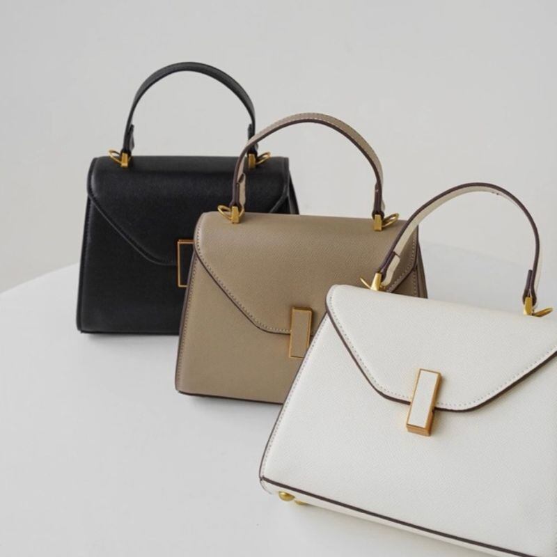 上品なスクエアシルエットにゴールドのアクセントを効かせたハンドバッグ。